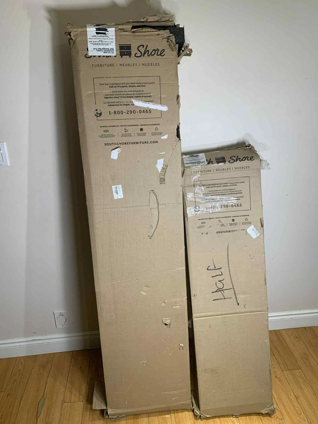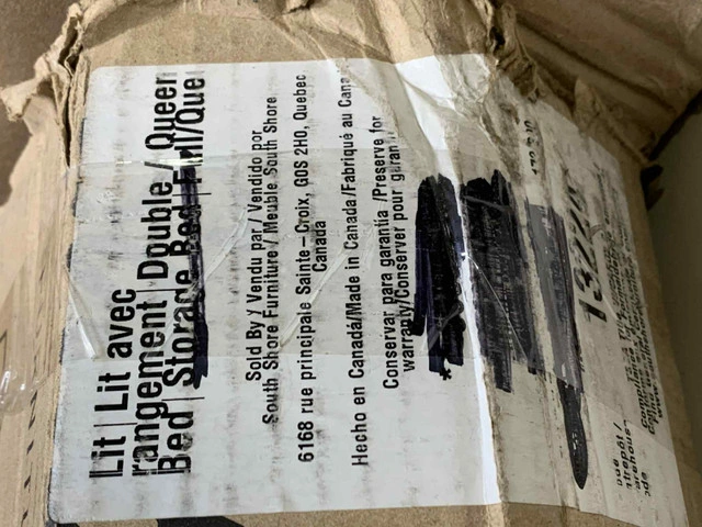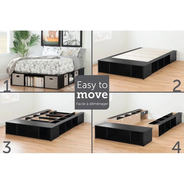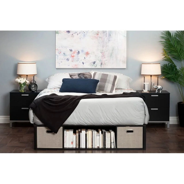 Brand new in box modern storage bed frame from South Shore in Black Oak finish. Easy to assemble, no box spring needed. Includes 4 matching fabric storage bins. Delivered flat-packed — full hardware and slats included. Fits both Full and Queen mattresses. Size | Full or Queen Finish | Black Oak Bins | 4 included Details | Open and closed cubby design Ideal For | Apartment living, student rooms, guest rooms Retail is $494+ — yours for just $280 CAD. Message here or call/text 289-788-8085 with any questions — happy to help.