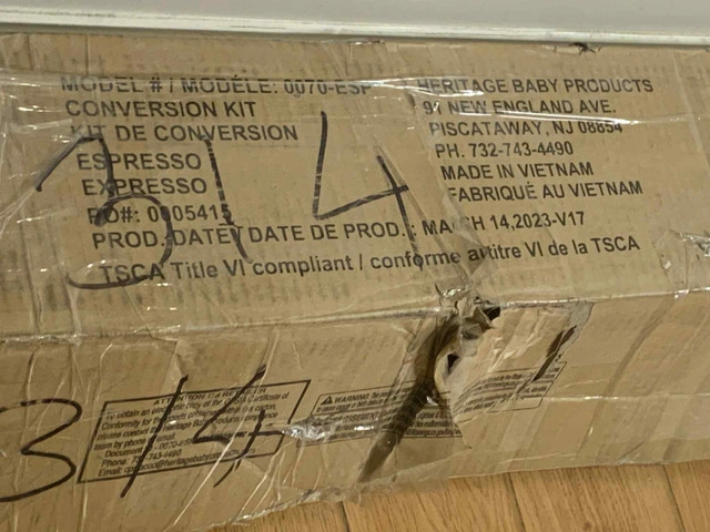 Convert your Baby Cache crib into a full-size bed with this new open box conversion kit in Espresso finish. ✅ Solid wood rails (Espresso) ✅ Includes: 2 rails, 4 slats, all hardware, printed instructions ✅ Compatible with 30+ Baby Cache cribs ✅ NOT compatible with Hudson, Portland, or Uptown ✅ Safe, non-toxic finishes This is a new open box item. All items are checked to the best of our ability. If anything is damaged or missing, we’ll offer a partial or full refund depending on the situation. Pickup in Oakville, Ontario Contact: Mohab at 289-788-8085 or message directly