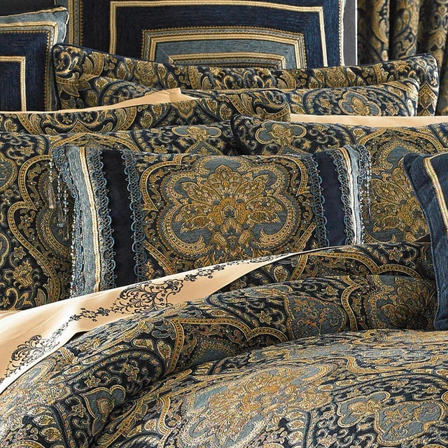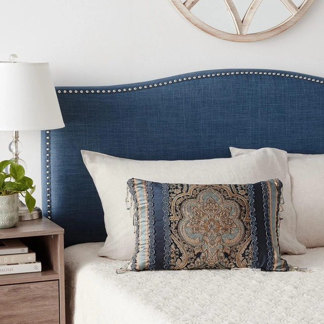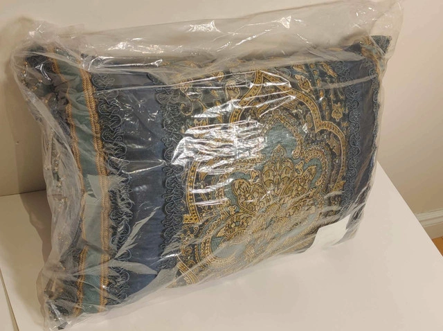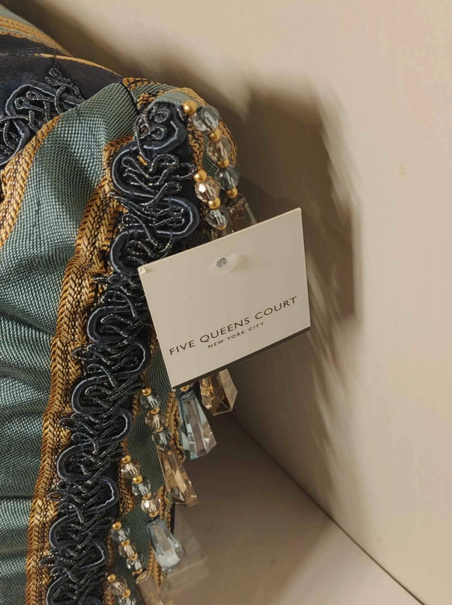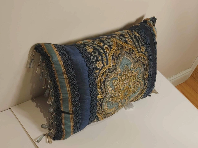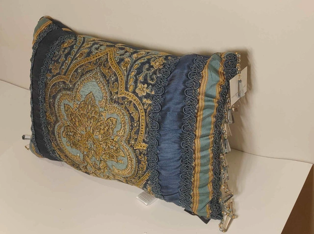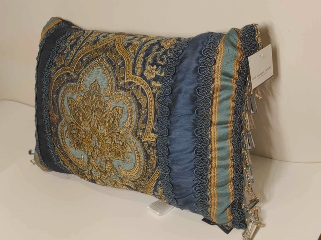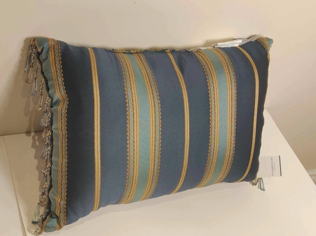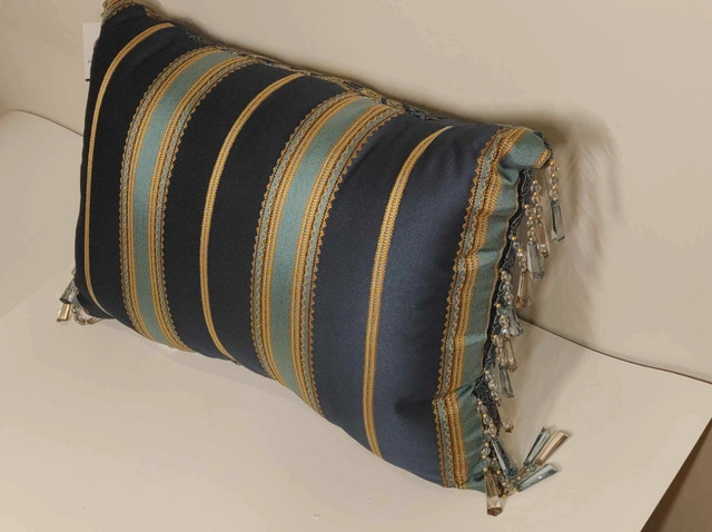 Add an elegant accent to your bed or sofa with the Palmer boudoir pillow by Five Queens Court. Featuring a bold damask center, vertical woven stripe borders, and a luxurious tassel fringe, this pillow brings regal flair to any room. Key Features: Dimensions: 15" x 21" High-quality jacquard chenille with faux silk back Stunning teal, gold, and navy blue colorway Decorative tassel fringe and reversible design Ideal as a luxe accent for bedding or living room decor Condition: New. For more information or pickup details, feel free to message directly or contact at 289 788 8085.
