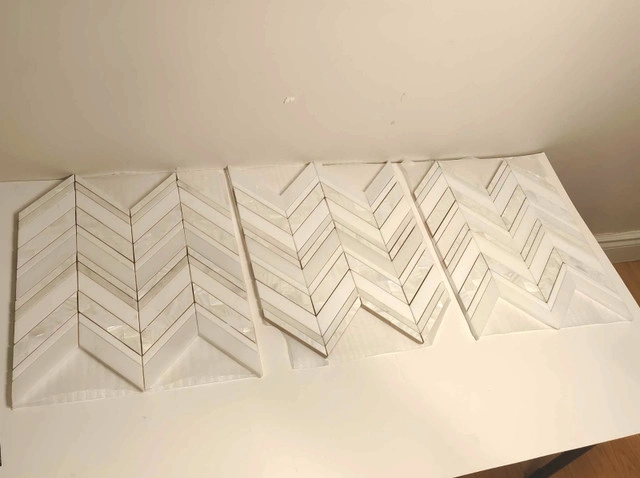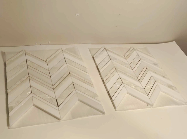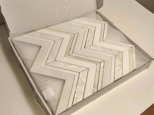 Transform your space with the MIR Mosaic Pearl Island tile from the Alaska Collection — a luxurious chevron-style mosaic made from Thassos marble and natural shell. With its polished finish and elegant detail, it's perfect for backsplashes, feature walls, and shower designs. What’s Included: We have ONE box in stock (5 sheets total = 5.08 sq. ft) Now 30% OFF – Premium tile at a fraction of the cost! Key Features: Sheet Size: 12" x 12.2" (interlocking edges) Material: Thassos Marble + Shell, mesh-mounted Use Areas: Kitchen, bathroom, accent walls, light-traffic floors Finish: Polished for a clean, luminous effect Coverage: 5 sheets = 5.08 sq. ft | 1.017 sq. ft per sheet Condition: Brand New (One sheet has a tiny, barely visible blemish, shown in the last photo) Installation Notes: Use Laticrete 254 Platinum mortar and Laticrete Permacolor grout Natural variations in color and tone are expected with genuine stone White marble may naturally develop yellowing in wet areas — not a defect, just character For more information or pickup details, feel free to message directly or contact at 289 788 8085.