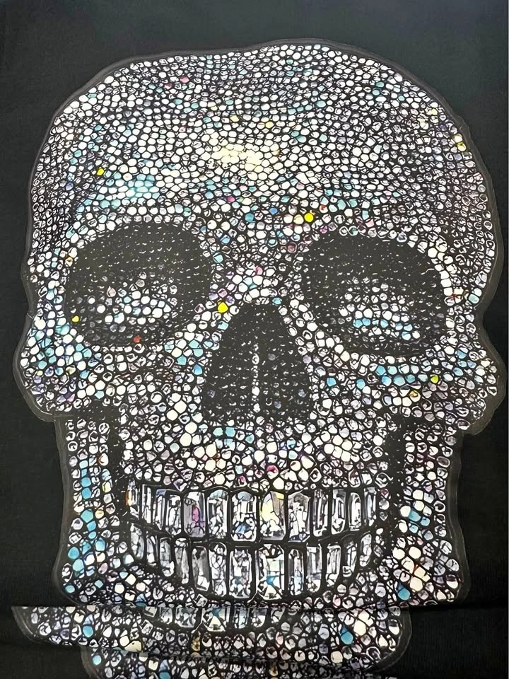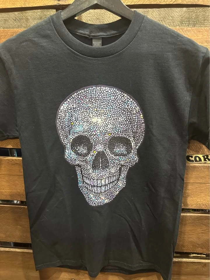 This is a Faux Glitter/Rhinestone skull. Sizes up to 2XL in stock. Additional sizes can be made upon request. Pickup Pickering Brock/kingston rd Sf/pf home