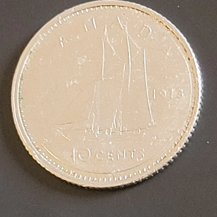Selling a Canadian dime from 1973. It features a sailing ship on one side and Queen Elizabeth II on the other