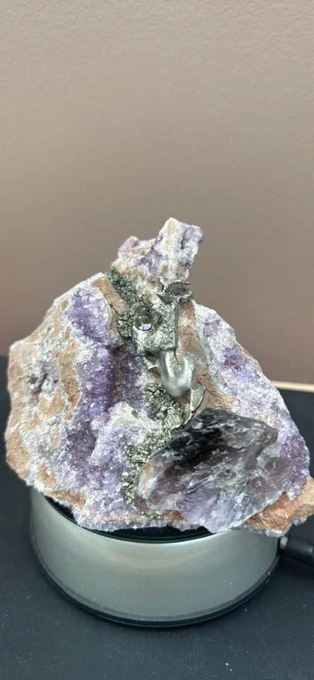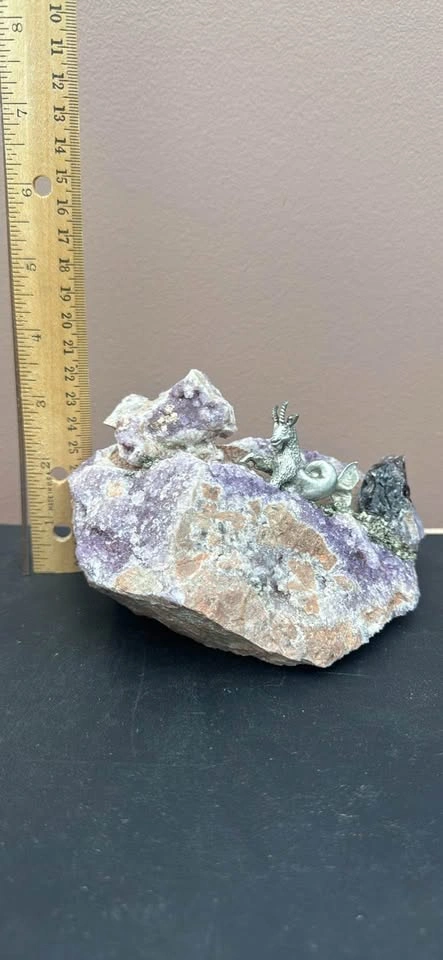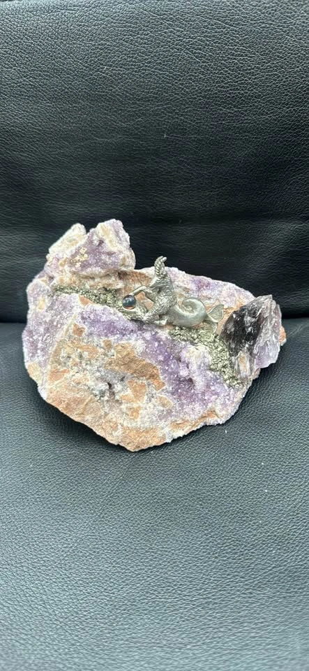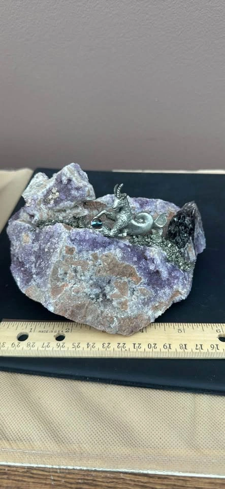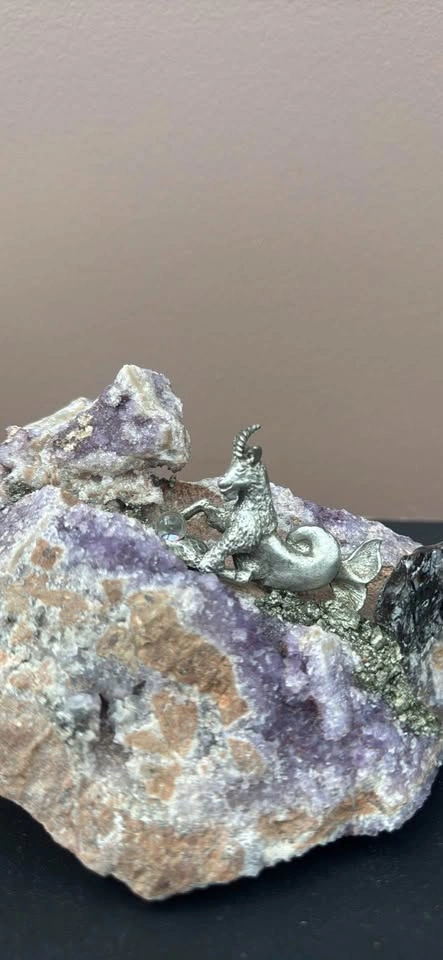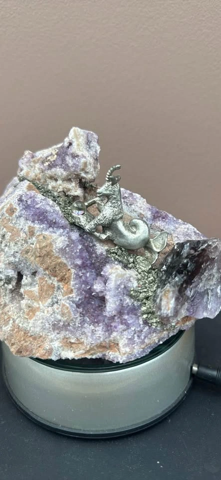 Perfect gift. This pewter sculpture is mounted on a beautiful chunk of amethyst and rock. This is Canadian amethyst from Thunder Bay, Ontario. Amethyst is the birthstone for February and the official gemstone of Ontario. Some believe that amethyst can bring good luck and that it represents wealth and peace. The sculpture affixed to the stone is a Sea Goat, a mythological creature half goat, half fish. It is a common representation, especially for the zodiac sign for Capricorn (December 22-January 19) The archer is placed artistically on a base of natural rock, amethyst and pyrite and features a colourful iridescent crystal ball. This piece was purchased in the early 1990’s, but never displayed. The artist’s card is included. It is 6 inches long, 6 inches wide and 3 1/2 inches tall approximately. Cash only please. No holds. Birchmount and Kingston Road area.