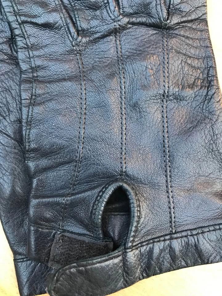 This pair of black leather unlined driving gloves is beautifully detailed, with a Velcro closing at the wrist. Fits ladies small, size 6 or 7. Lightly used but in good condition. SF home.