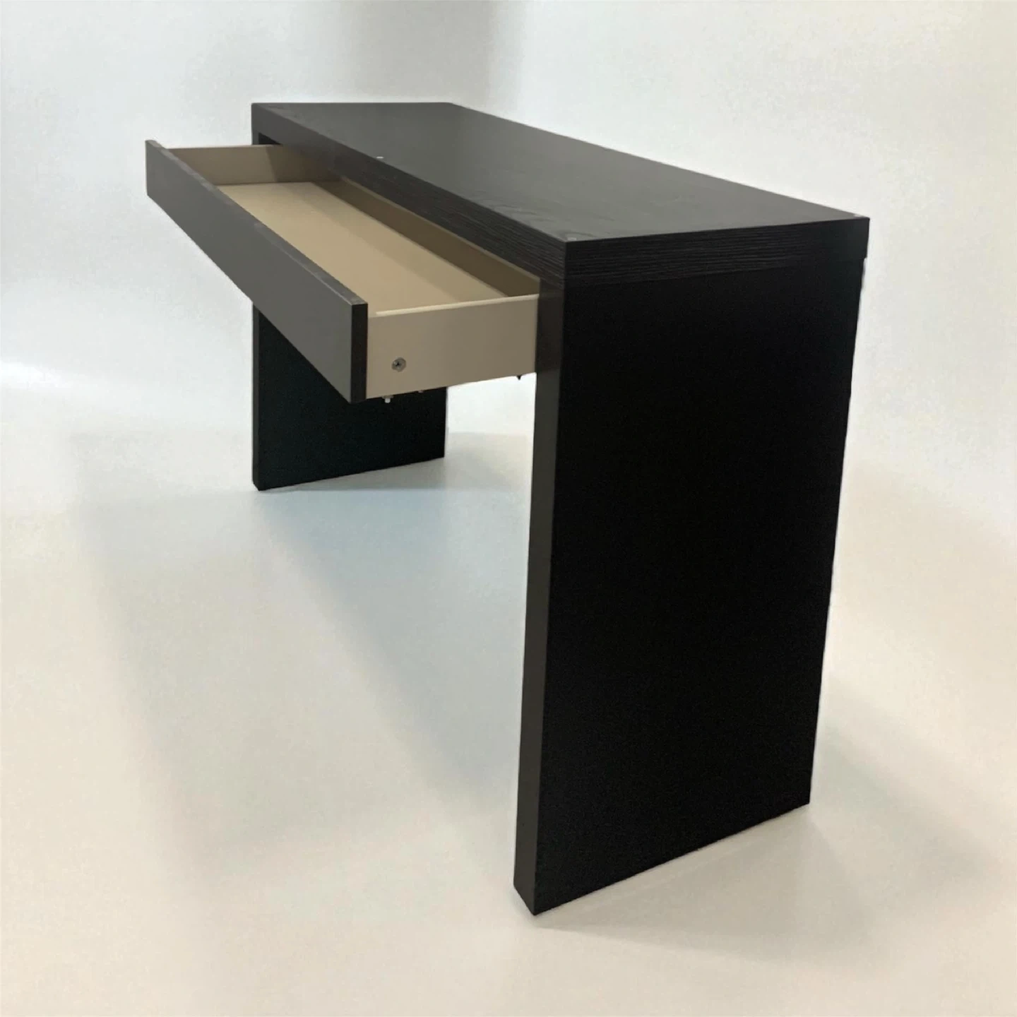 ~ Price is FIRM. 50% off new. (unless buying 2 more items). ~ Pick-up and cash only please. ~ Location Humber Bay Shores, see Map on listing. ~ Make sure desk fits in your transportation before msg me. ~ Payment must be done before carrying over. ~ No holds. Must go Thx! Selling a beautiful desk to the first one coming to pick it up. • Black-brown (colour discont.) • Very sturdy since it has full plank sides instead of legs. • It has a full width lenght drawer, smooth running w/ pull-out stop. • Excellent condition, like new, except for a few minimal scratches on top (zoom-in pic) • Measurments: W47.1/4” x D16.1/8” x H30.3/4”. W120cm x D41cm x H78cm.