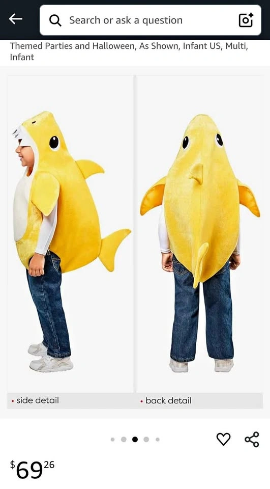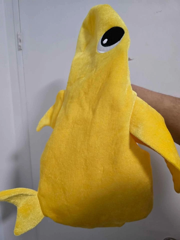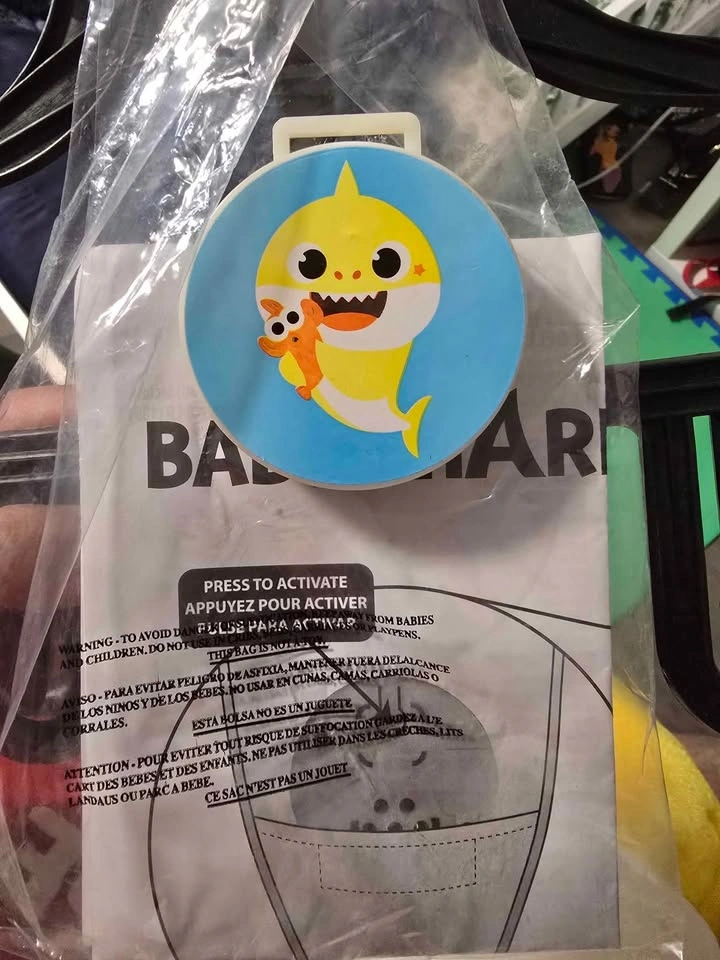 As good as new - baby shark costume fits 12 to 18 months. With a device that sings baby shark perfectly working condition.