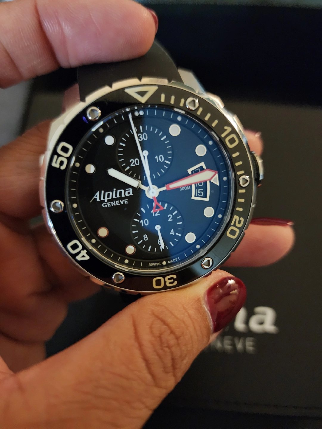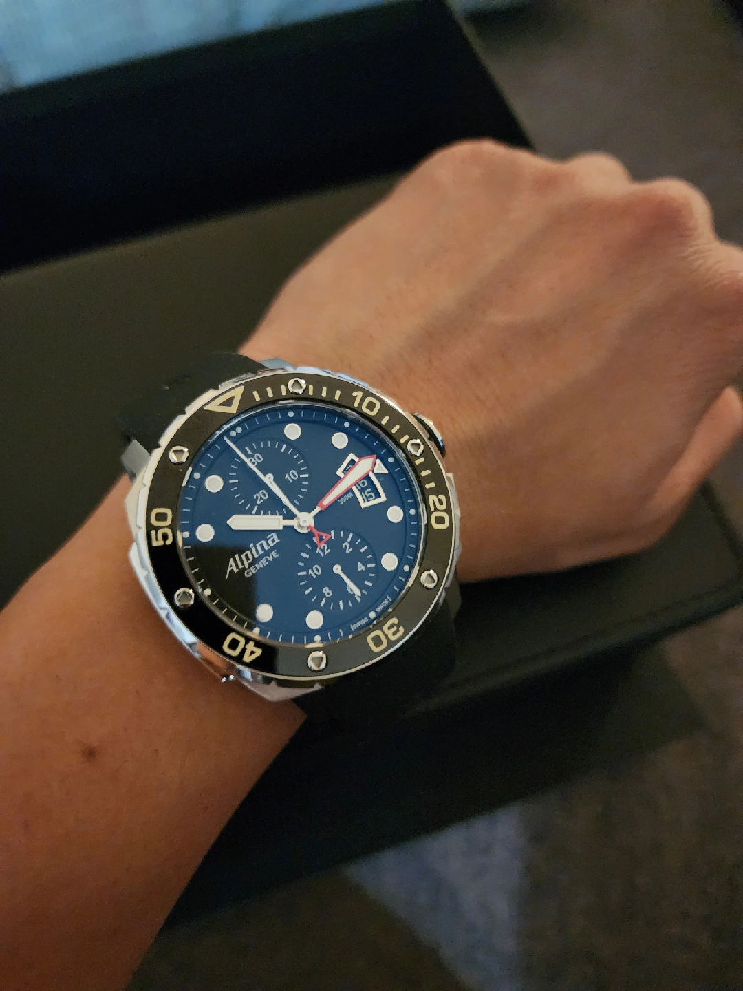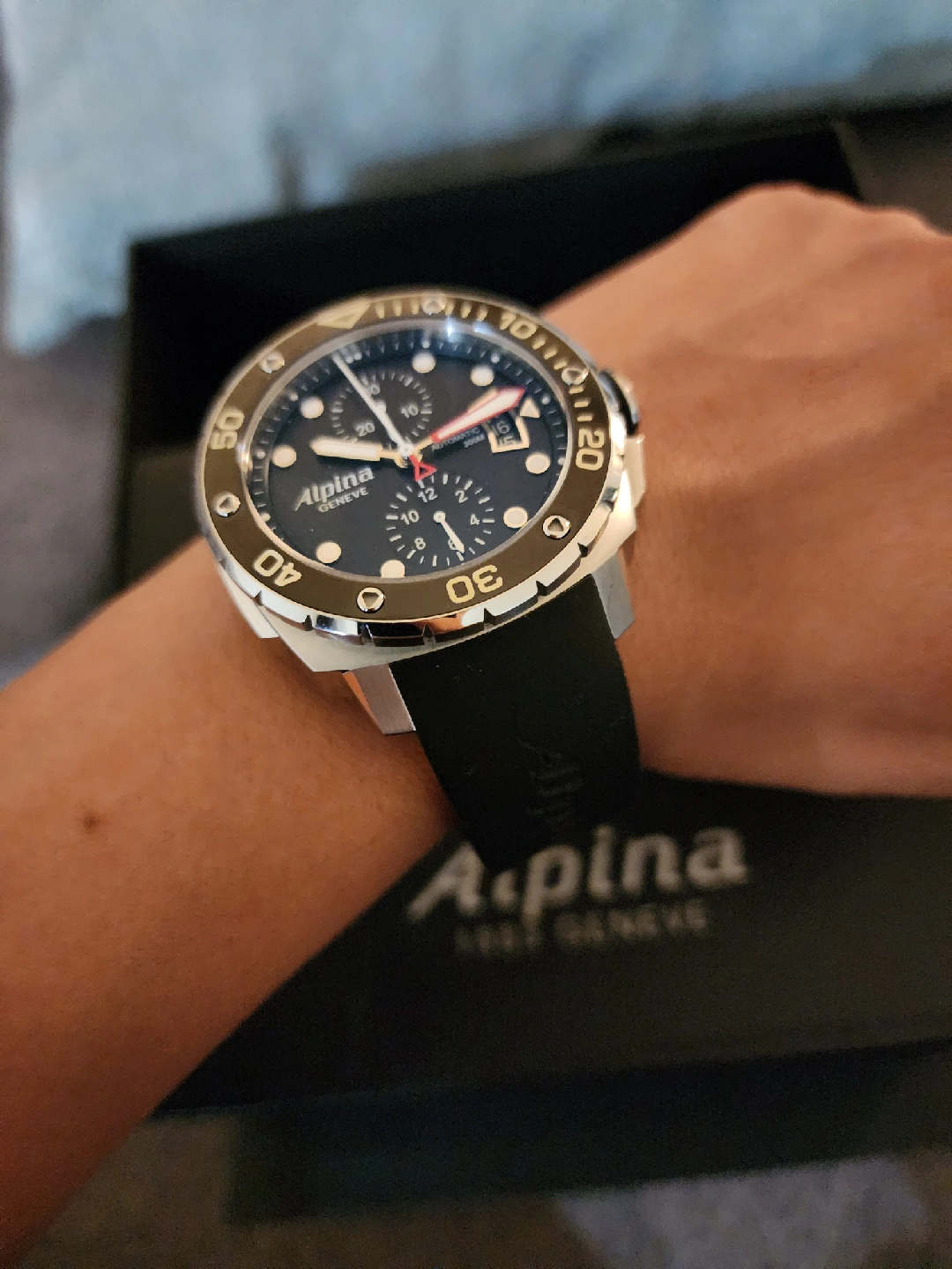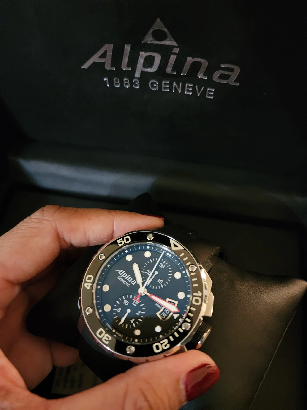Selling a new Alpina 1883 Geneve automatic watch! It comes in its original box. The watch features a black face with chronograph dials and a date display. It has a black rubber strap and a stainless steel bezel. It's a stylish and reliable timepiece!