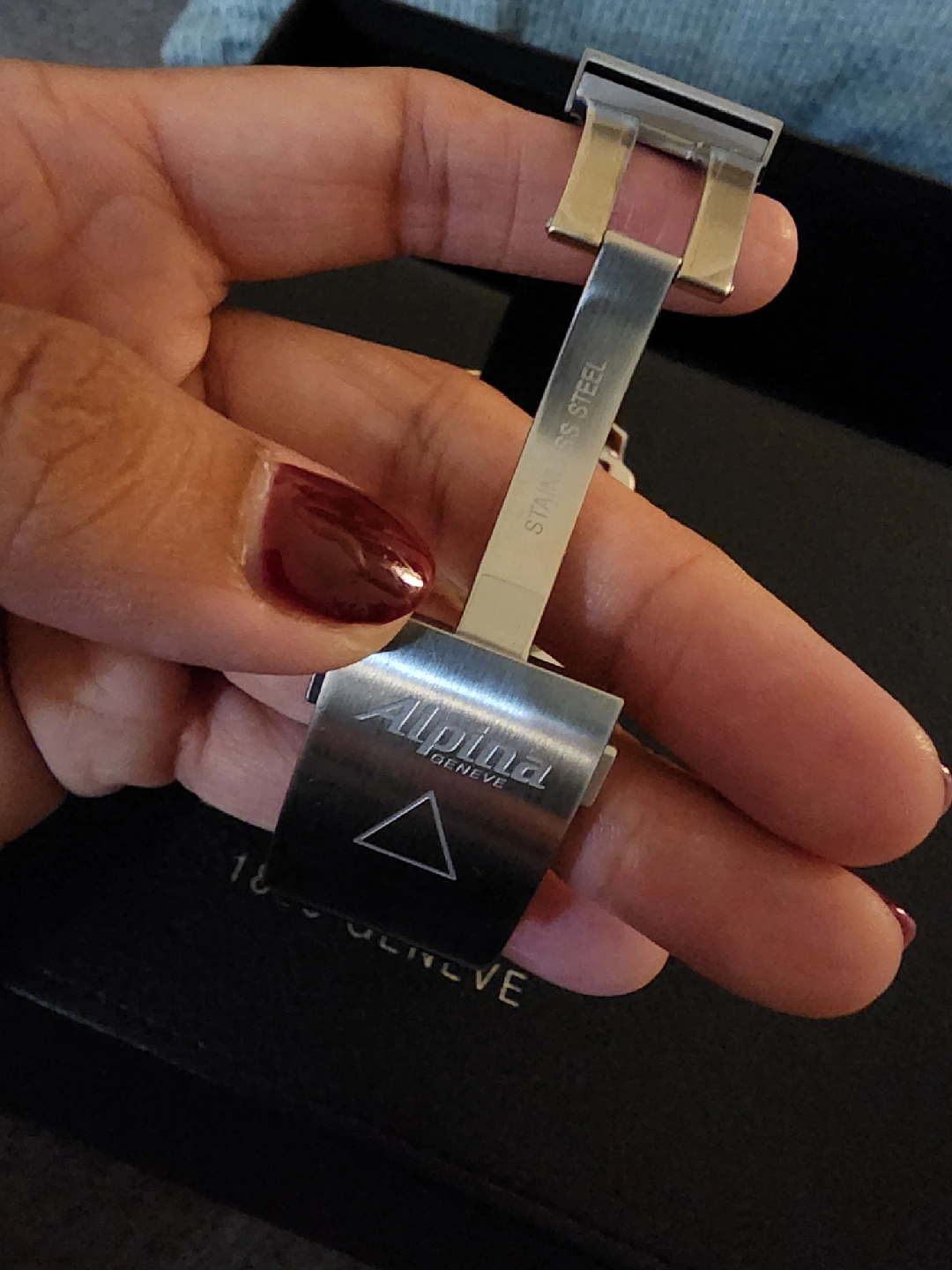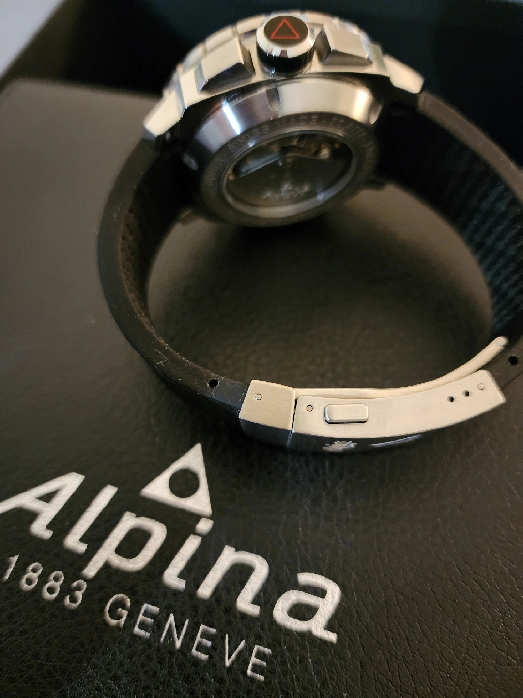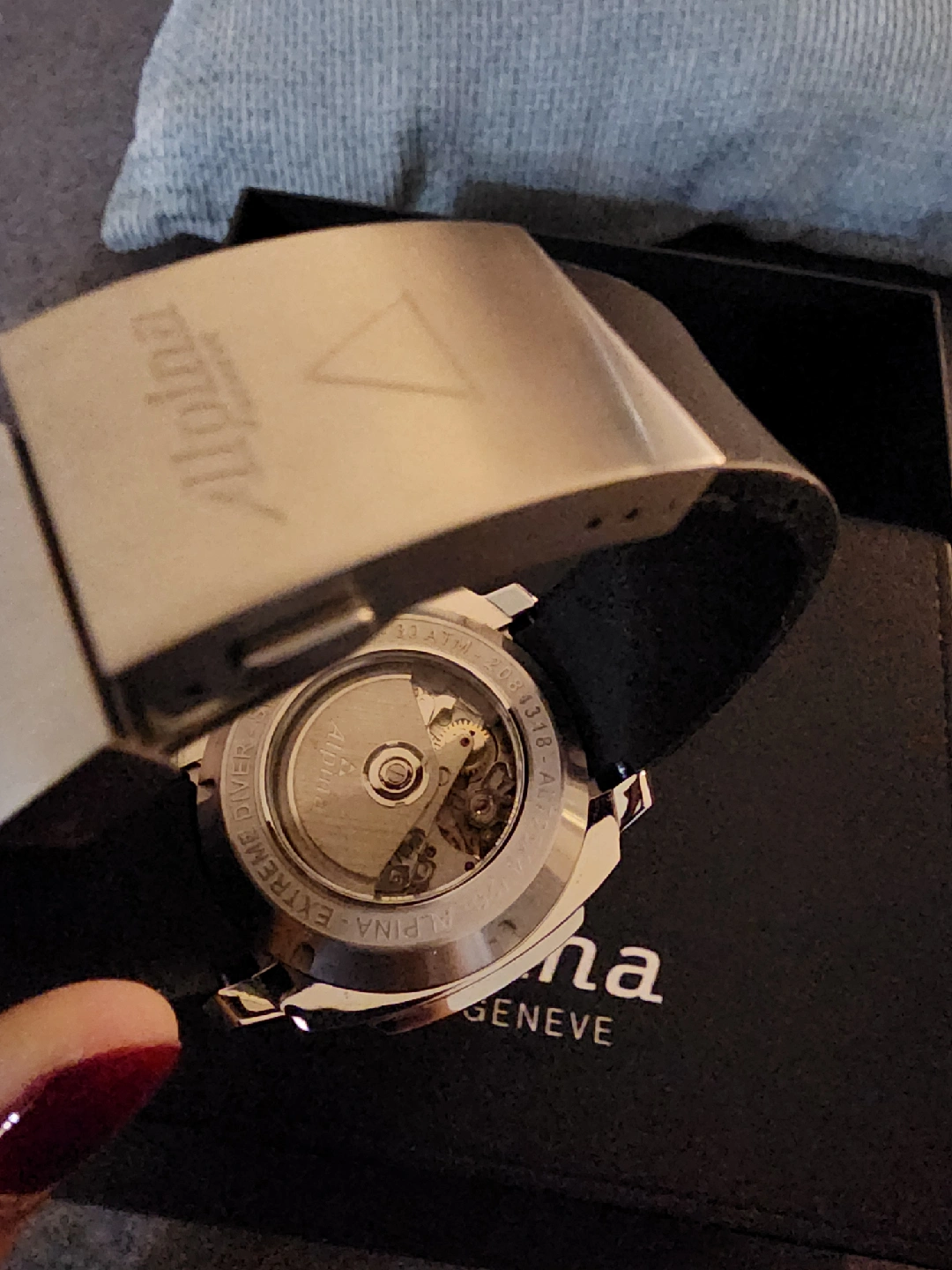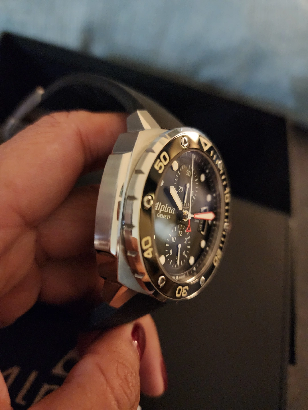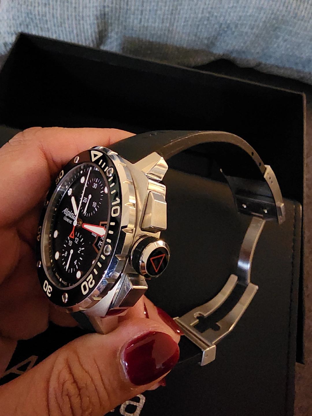 Selling a new Alpina 1883 Geneve automatic watch! It comes in its original box. The watch features a black face with chronograph dials and a date display. It has a black rubber strap and a stainless steel bezel. It's a stylish and reliable timepiece!