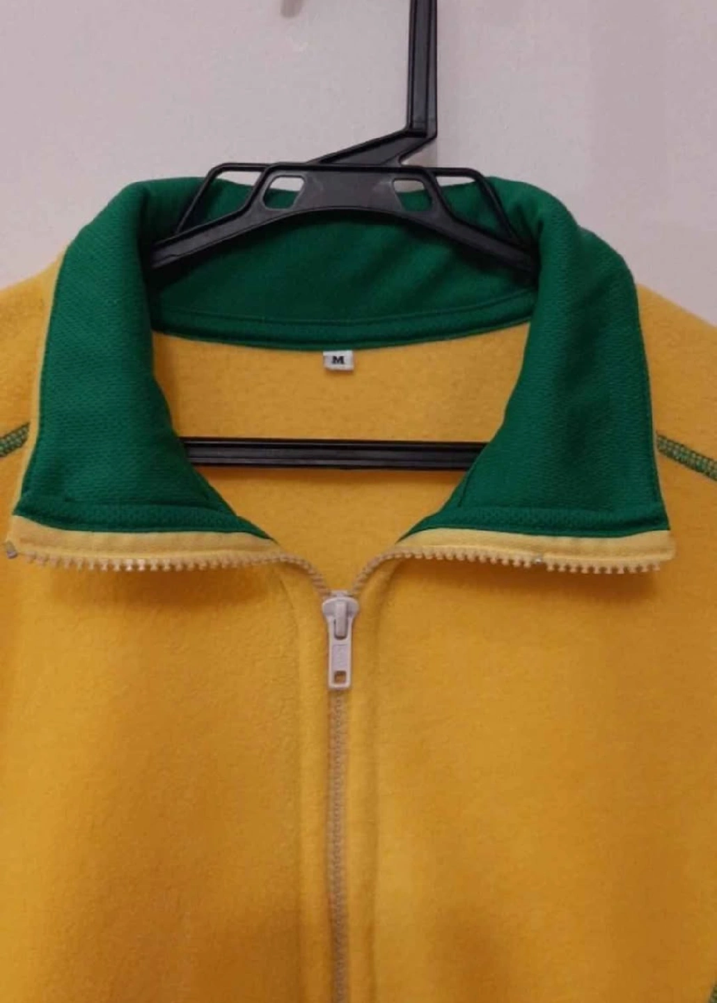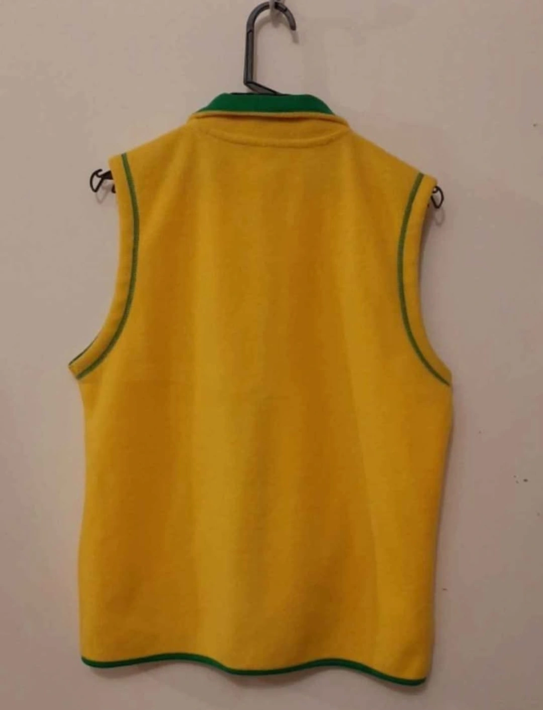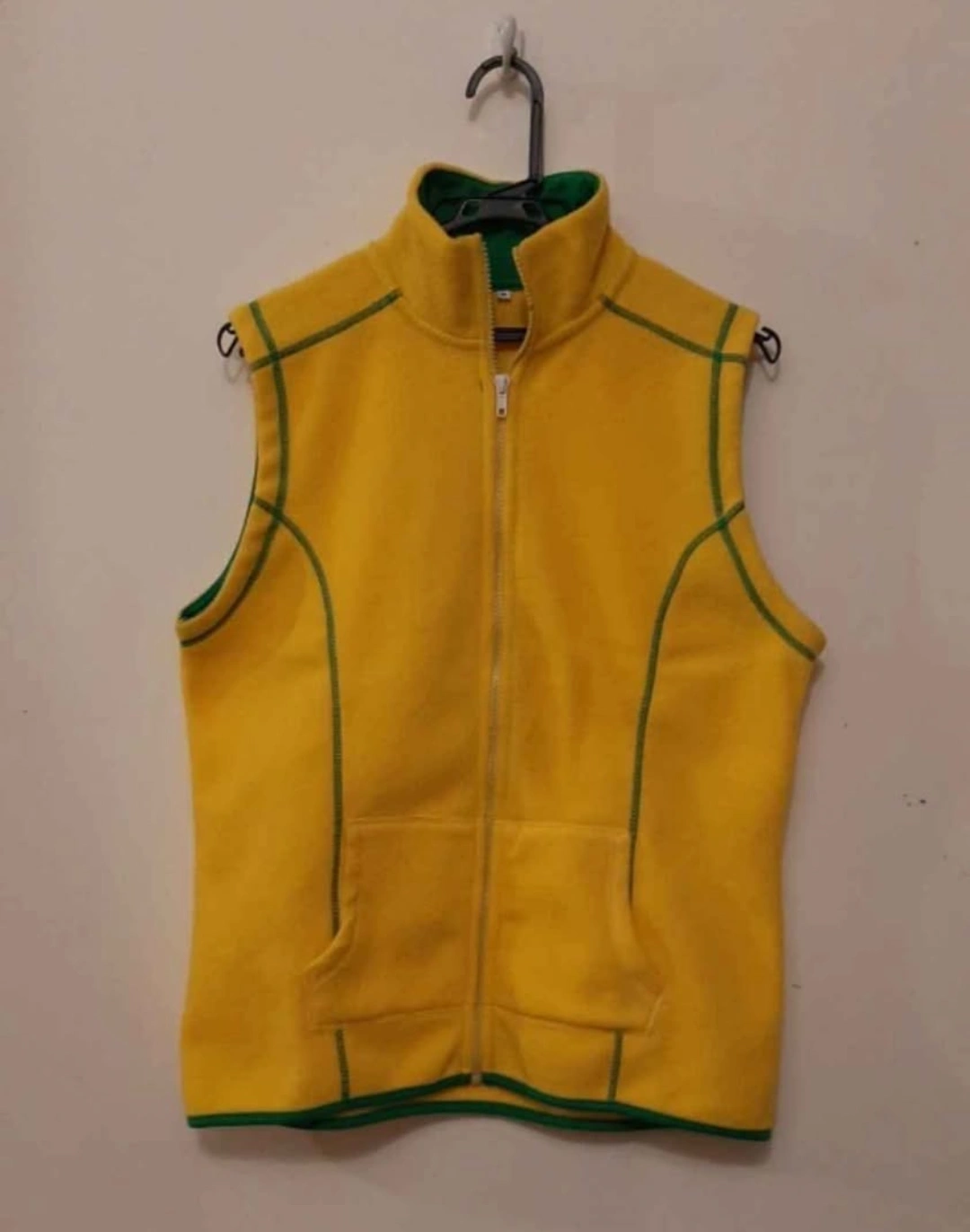 Cozy yellow fleece vest with green trim! This vest is in great condition and features a full zipper and a handy pocket. Perfect for layering on those chilly days!
