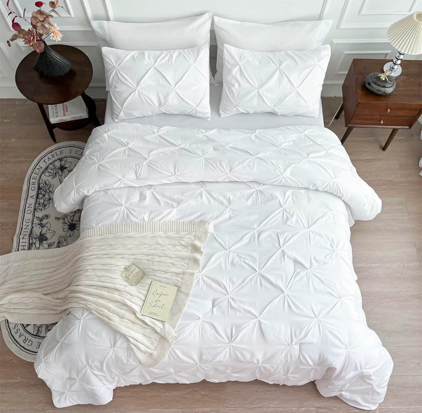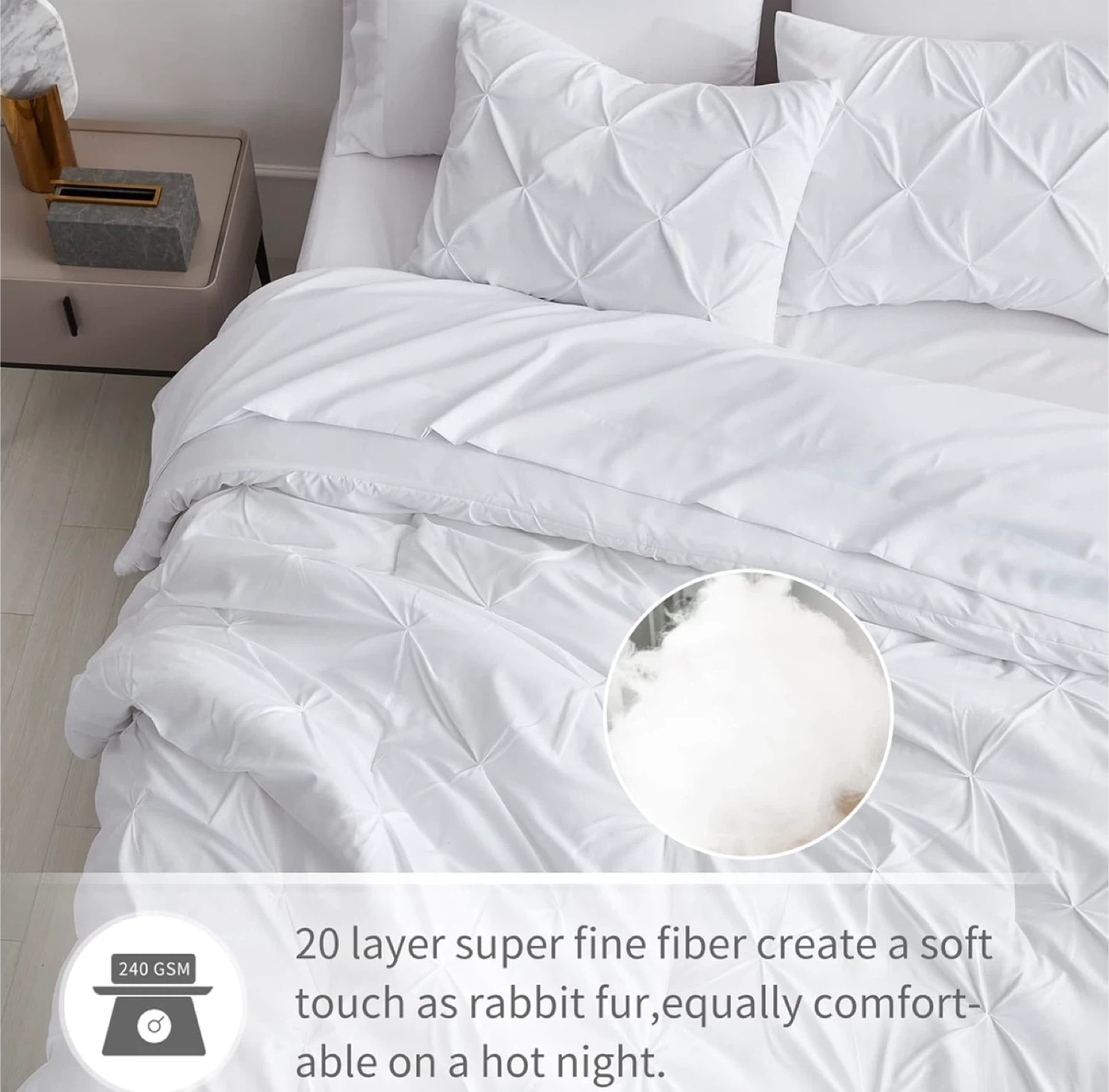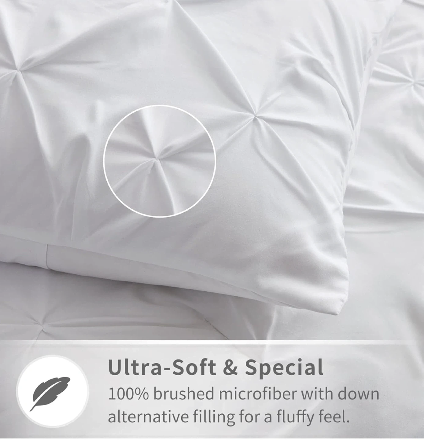 This is a lovely white bedding set made with ultra-soft 100% brushed microfiber and down alternative filling for a fluffy feel. The fitted sheet is fully elastic and fits mattresses up to 14 inches deep. It would look great in any bedroom!note it’s a 7 pieces set includes 1 comforter 1 fitted sheet 1 flat sheet 2 pillow shams 2 pillow cases.