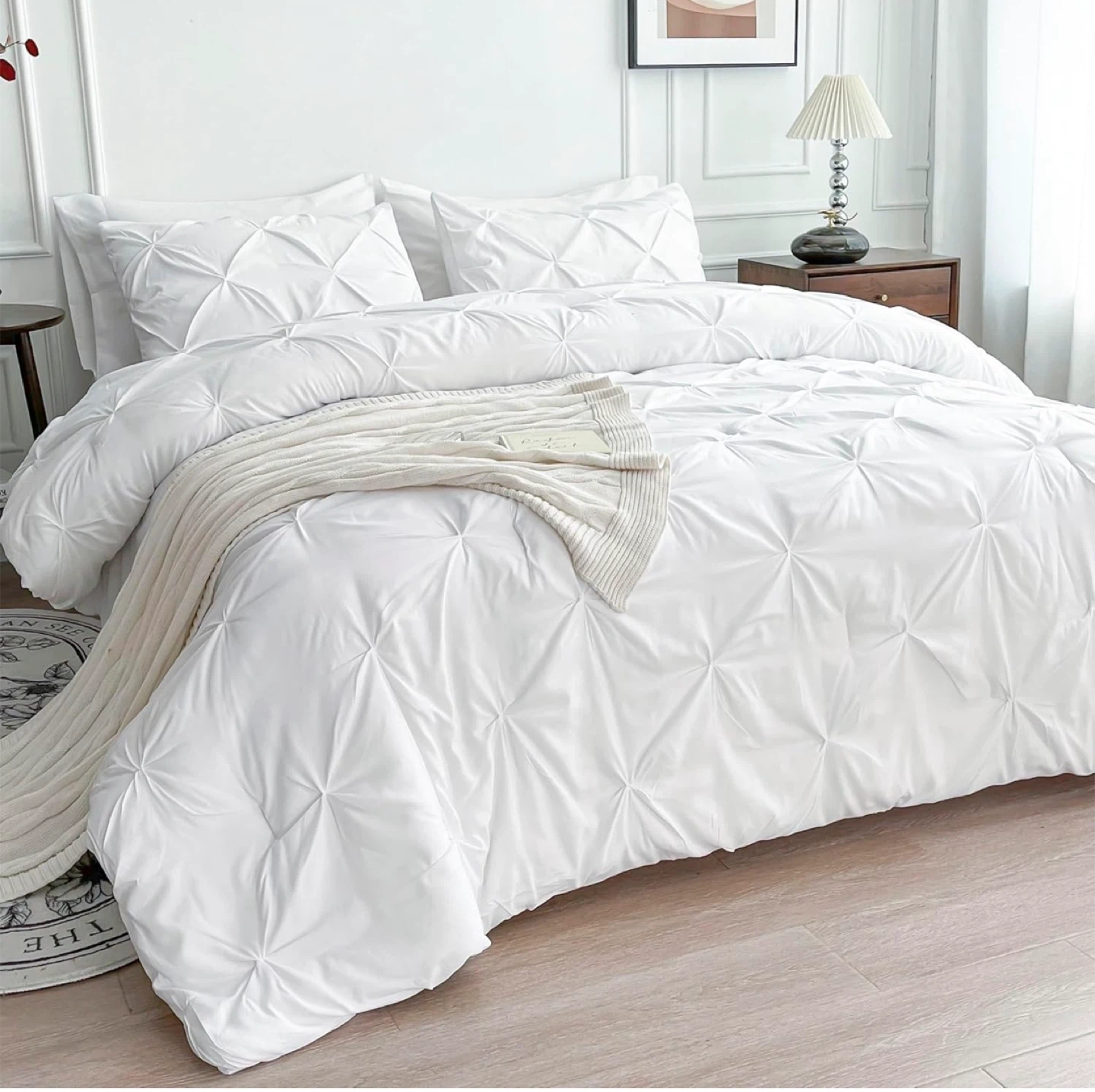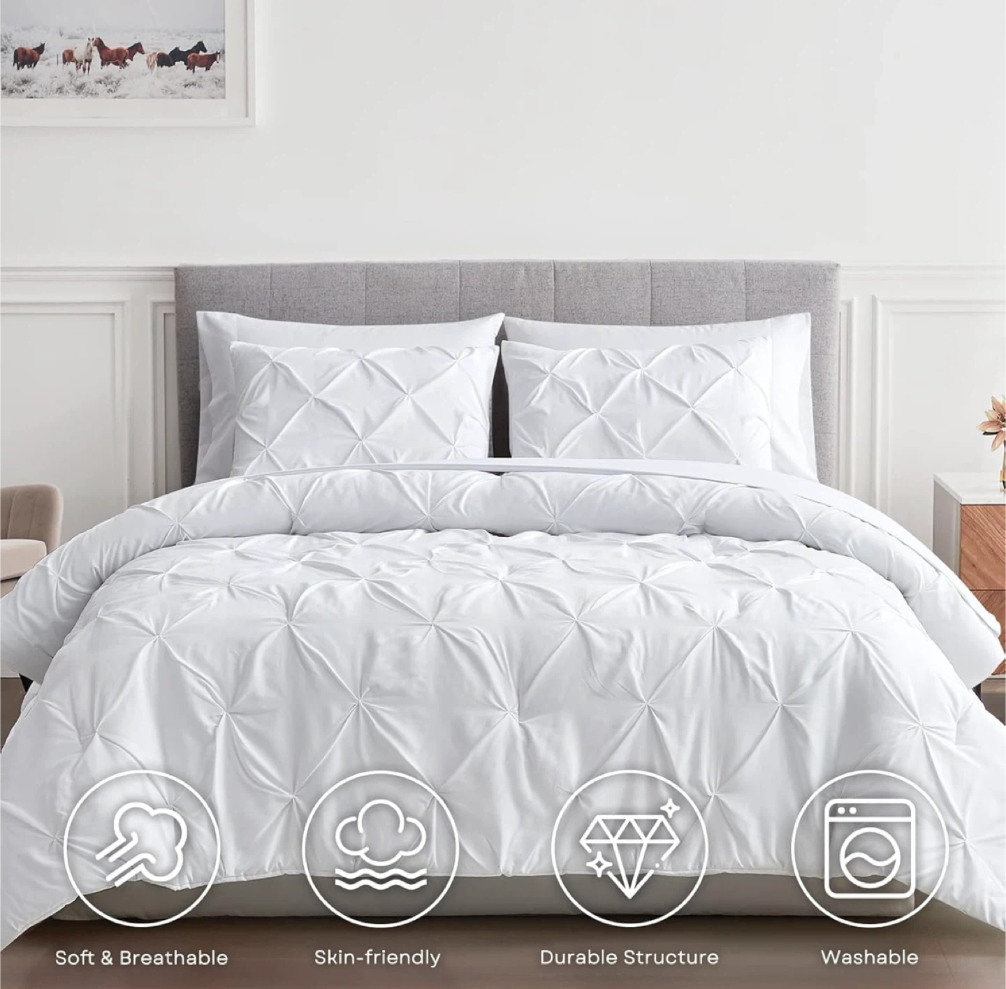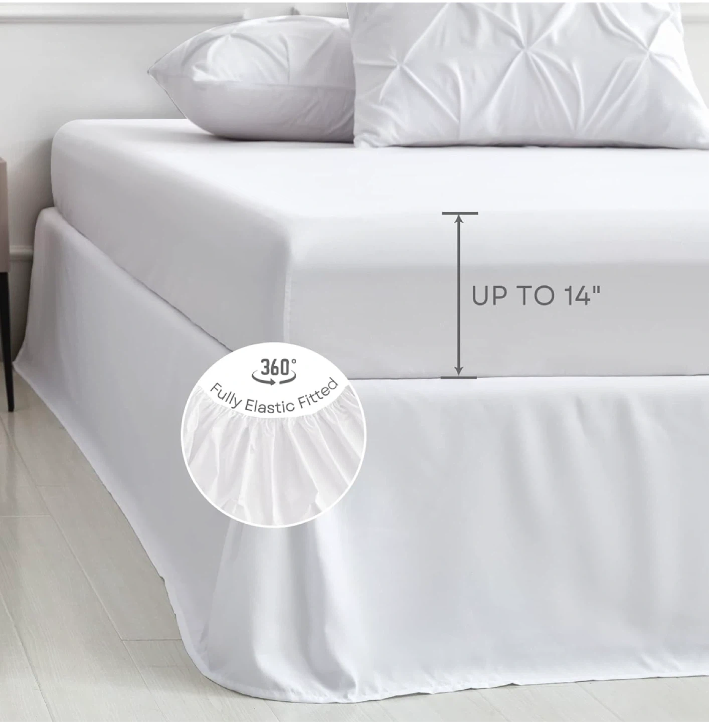This is a lovely white bedding set made with ultra-soft 100% brushed microfiber and down alternative filling for a fluffy feel. The fitted sheet is fully elastic and fits mattresses up to 14 inches deep. It would look great in any bedroom!note it’s a 7 pieces set includes 1 comforter 1 fitted sheet 1 flat sheet 2 pillow shams 2 pillow cases.
