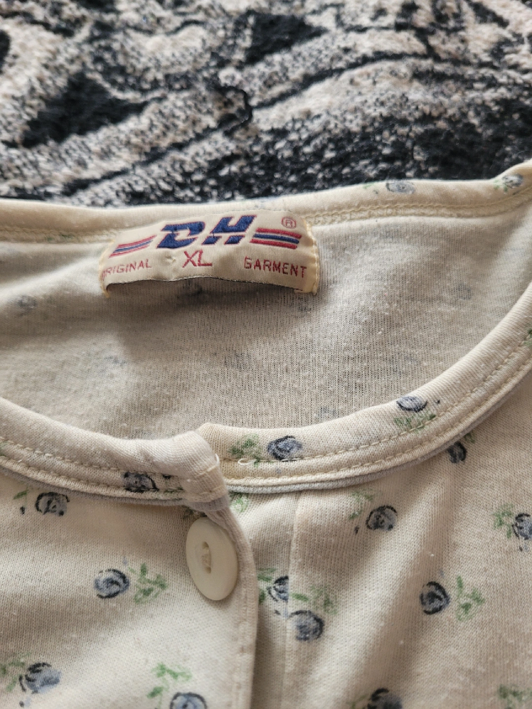 This is a DH Original Garment long-sleeved top in size XL. It features a cream colour with a floral pattern. It has a button-up design at the top. It's in great condition and ready for a new home