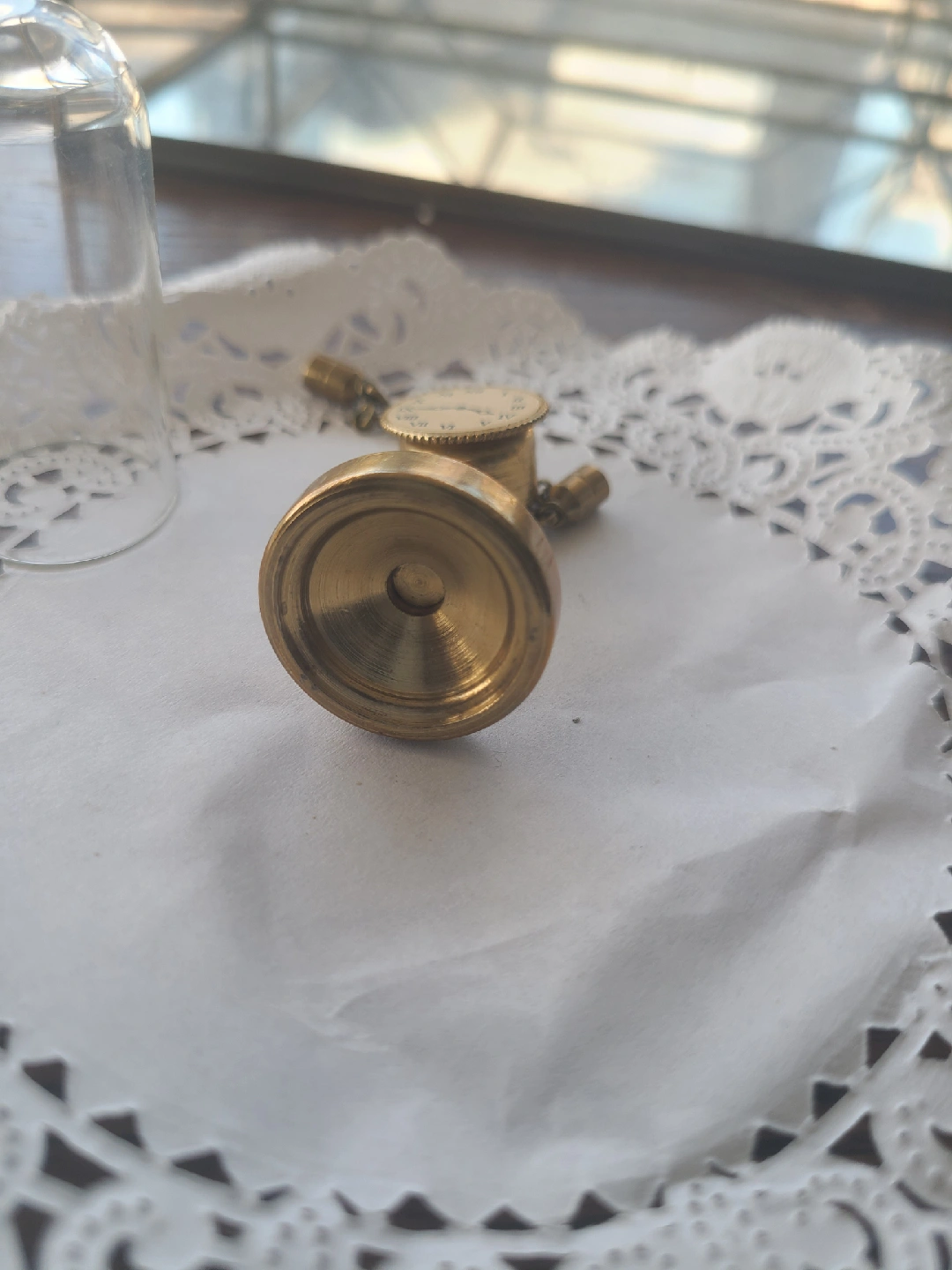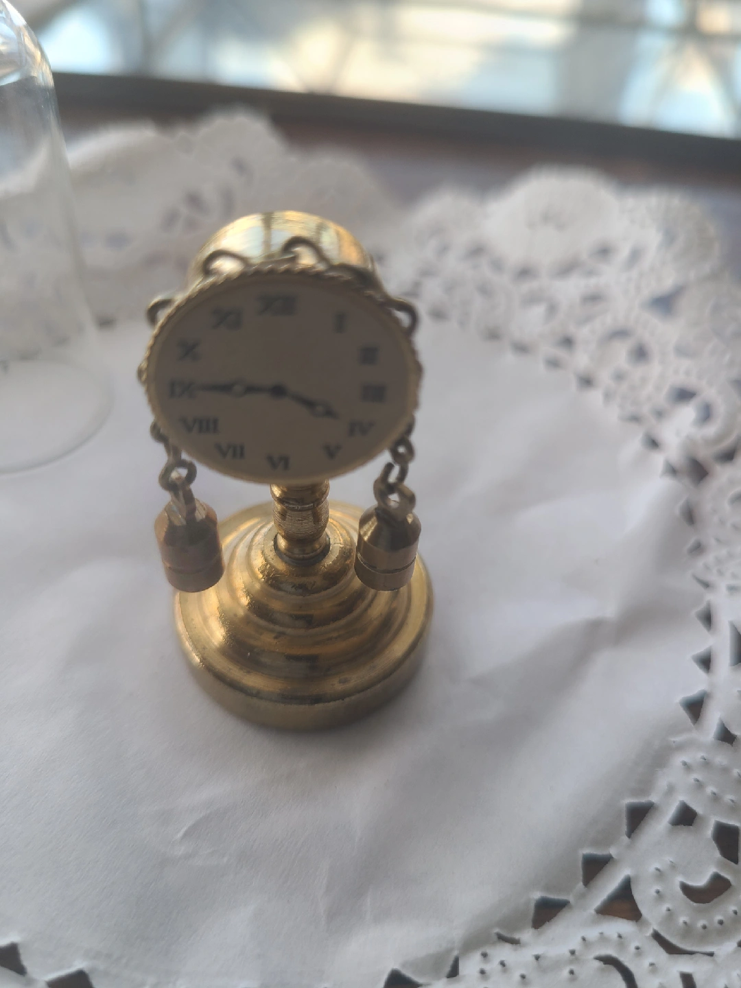 A charming miniature brass clock encased in a glass bottle. It's a unique decorative piece that adds a touch of vintage flair to any space. The clock face features Roman numerals, and the brass stand gives it an elegant look.