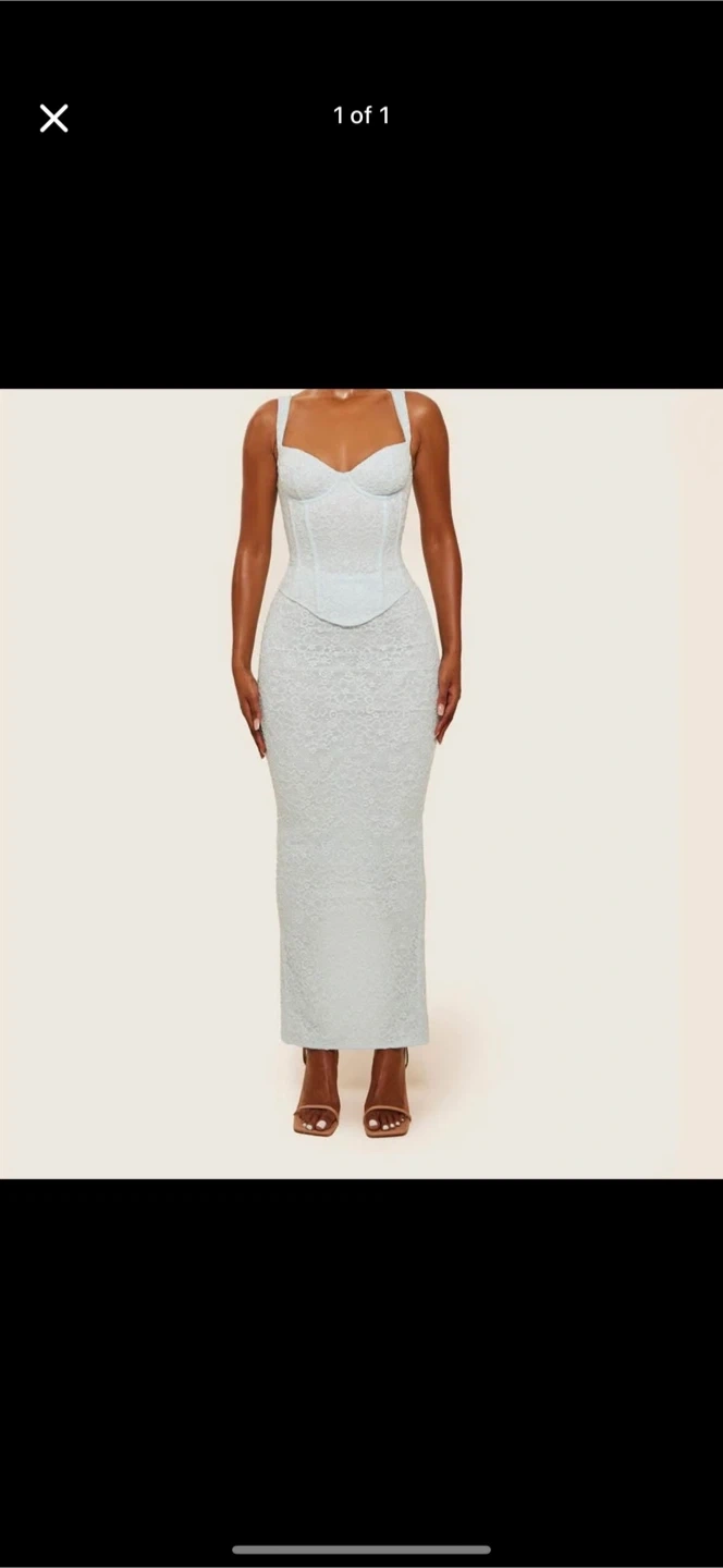 This is a beautiful lace corset maxi dress. It's a stunning piece that's perfect for a special occasion. The dress features a delicate lace overlay and a flattering corset bodice. It's in great condition and ready for a new home! Two sizes available - size 10 and size 8