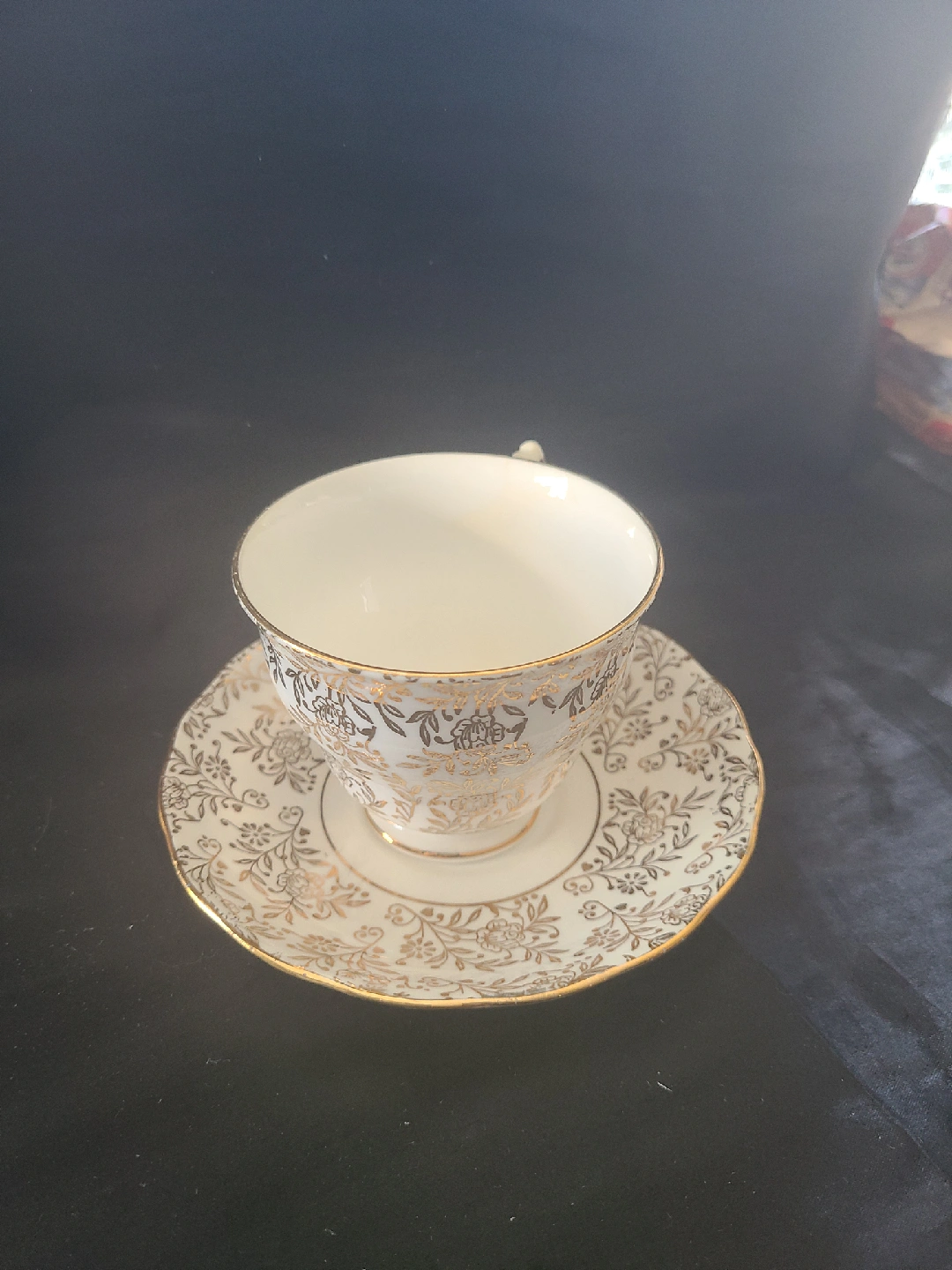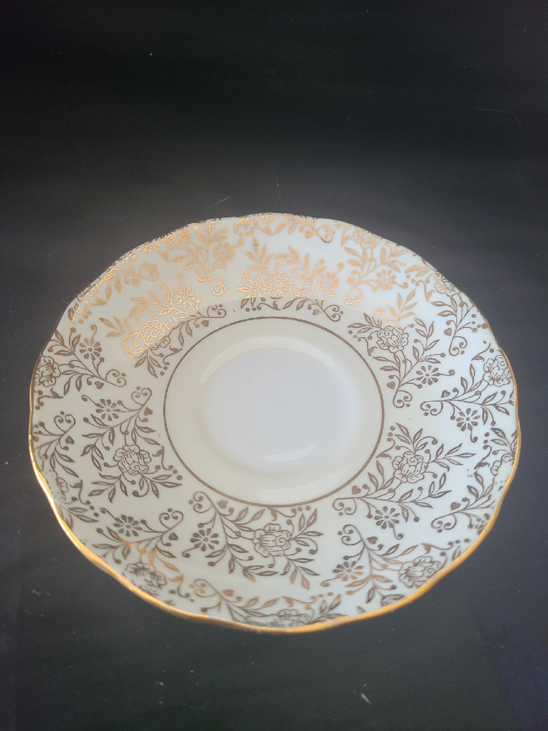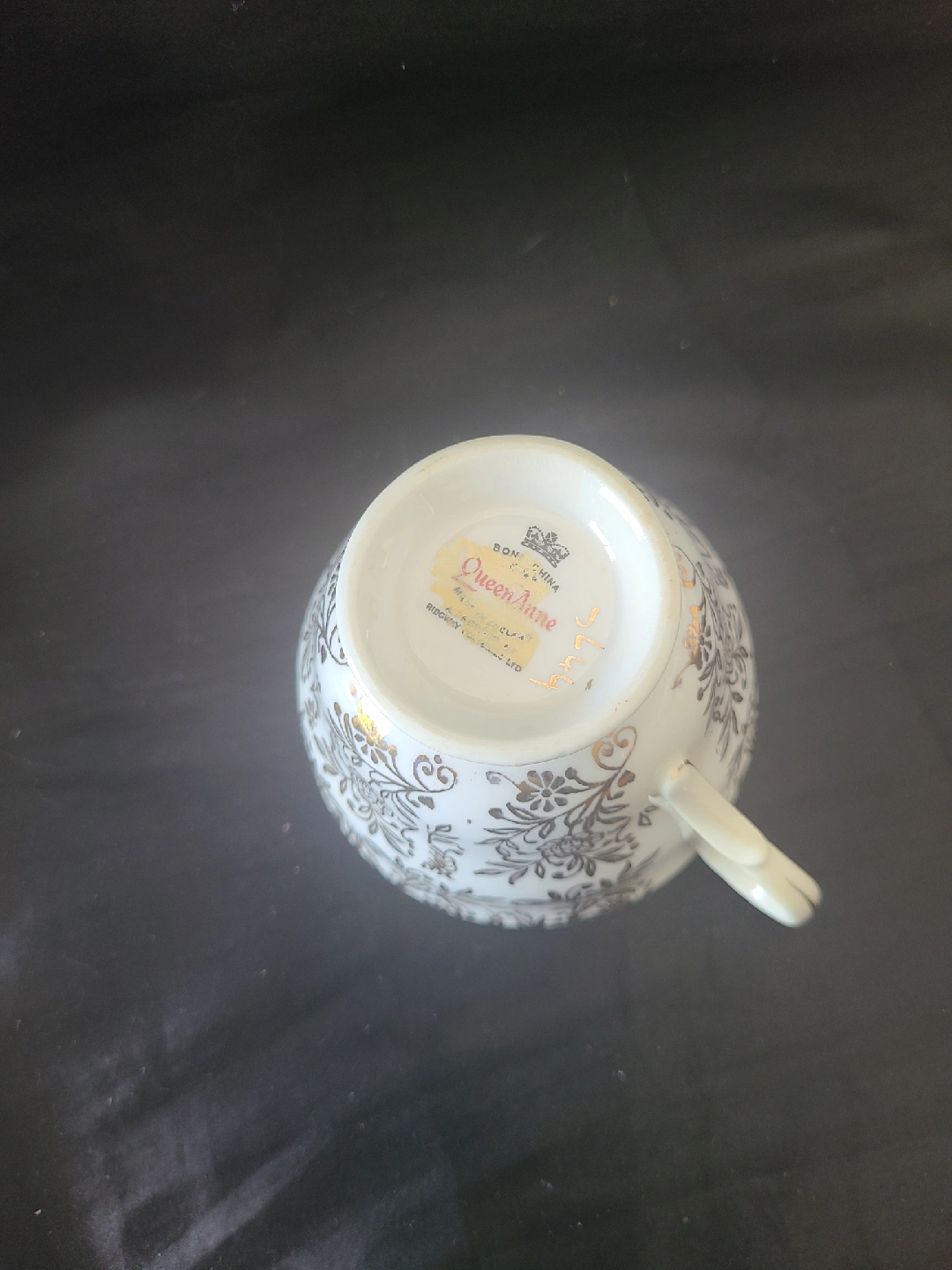 Here's a lovely Queen Anne teacup and saucer set! It features a delicate gold floral pattern on a white background.