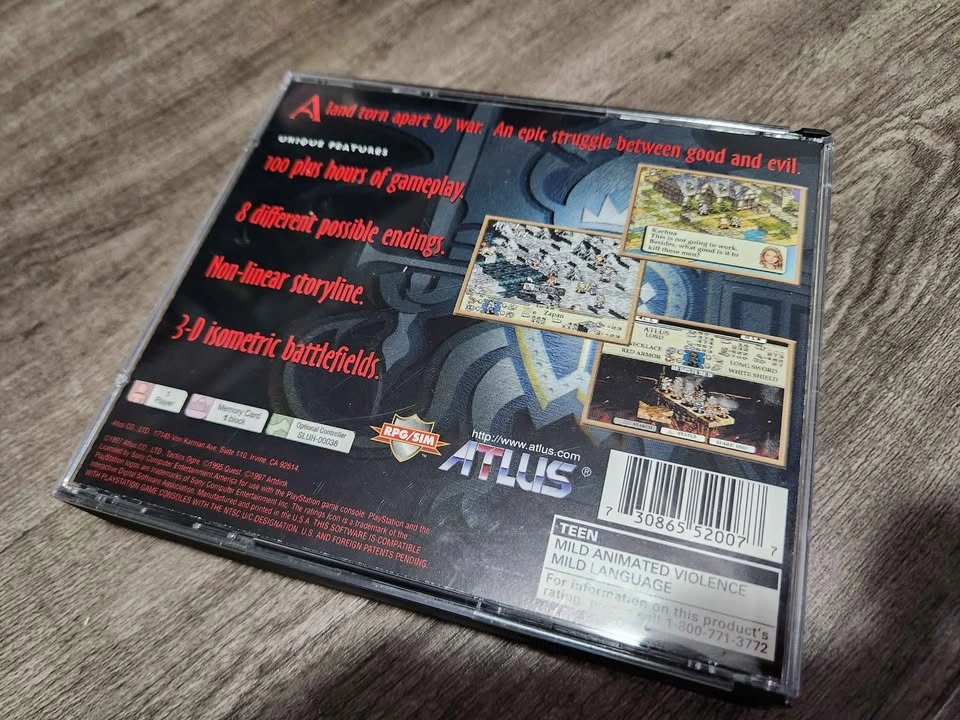 Classic PlayStation 1 strategy RPG for collectors and fans. Title: Tactics Ogre: Let Us Cling Together Region: NTSC (North America) Condition: Great – disc, manual, and original case included Complete in Box (CIB): Yes Tested and working, excellent addition for any retro PlayStation collection. This game is highly sought after and collectible.