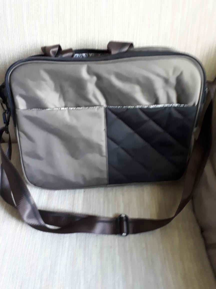 Here's a QKG laptop bag in great shape. It's a stylish grey and black colour, perfect for carrying your laptop and other essentials. The interior has a cool patterned lining and multiple compartments to keep everything organized. The shoulder strap is also included.