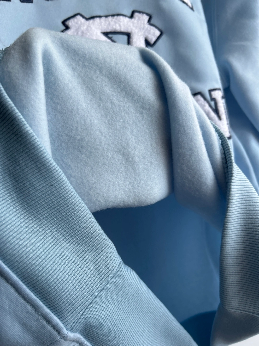Cozy up in this light blue North Carolina crewneck sweatshirt! It's in great condition and perfect for showing off your school spirit or just staying comfortable on a chilly day. The embroidered lettering and logo add a nice touch