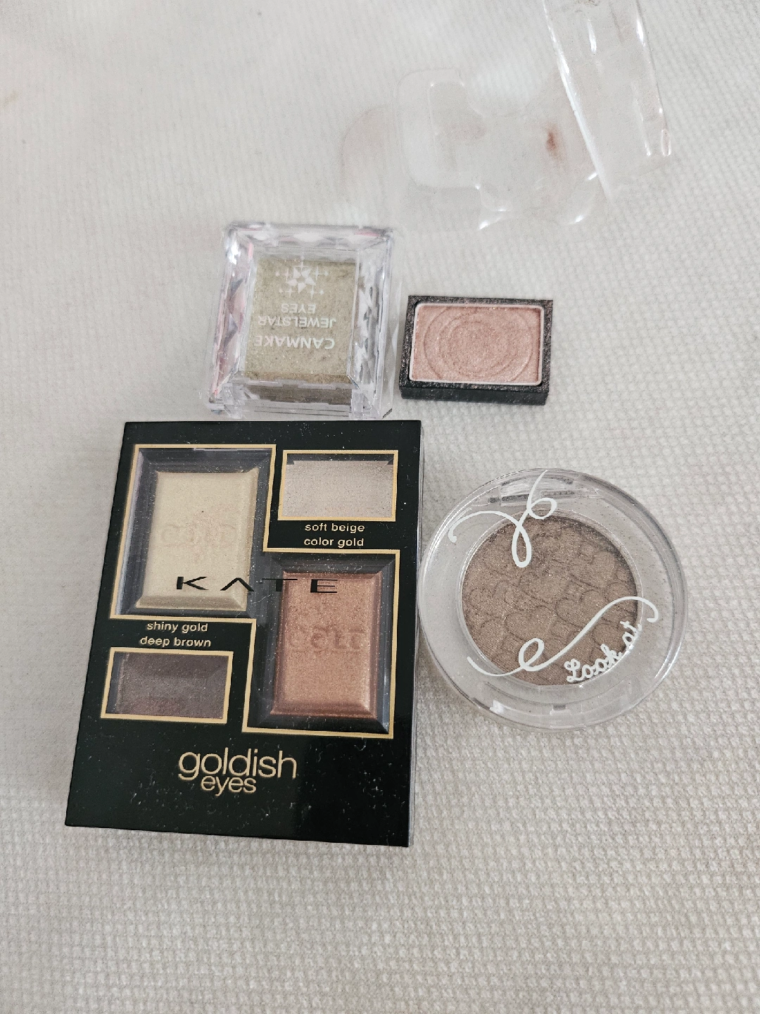 Selling a mixed lot of eyeshadows! Includes: - Canmake Jewelstar Eyes - Kate Goldish Eyes palette with shiny gold, soft beige color gold, and deep brown shades - Look at single eyeshadow Perfect for experimenting with different looks!