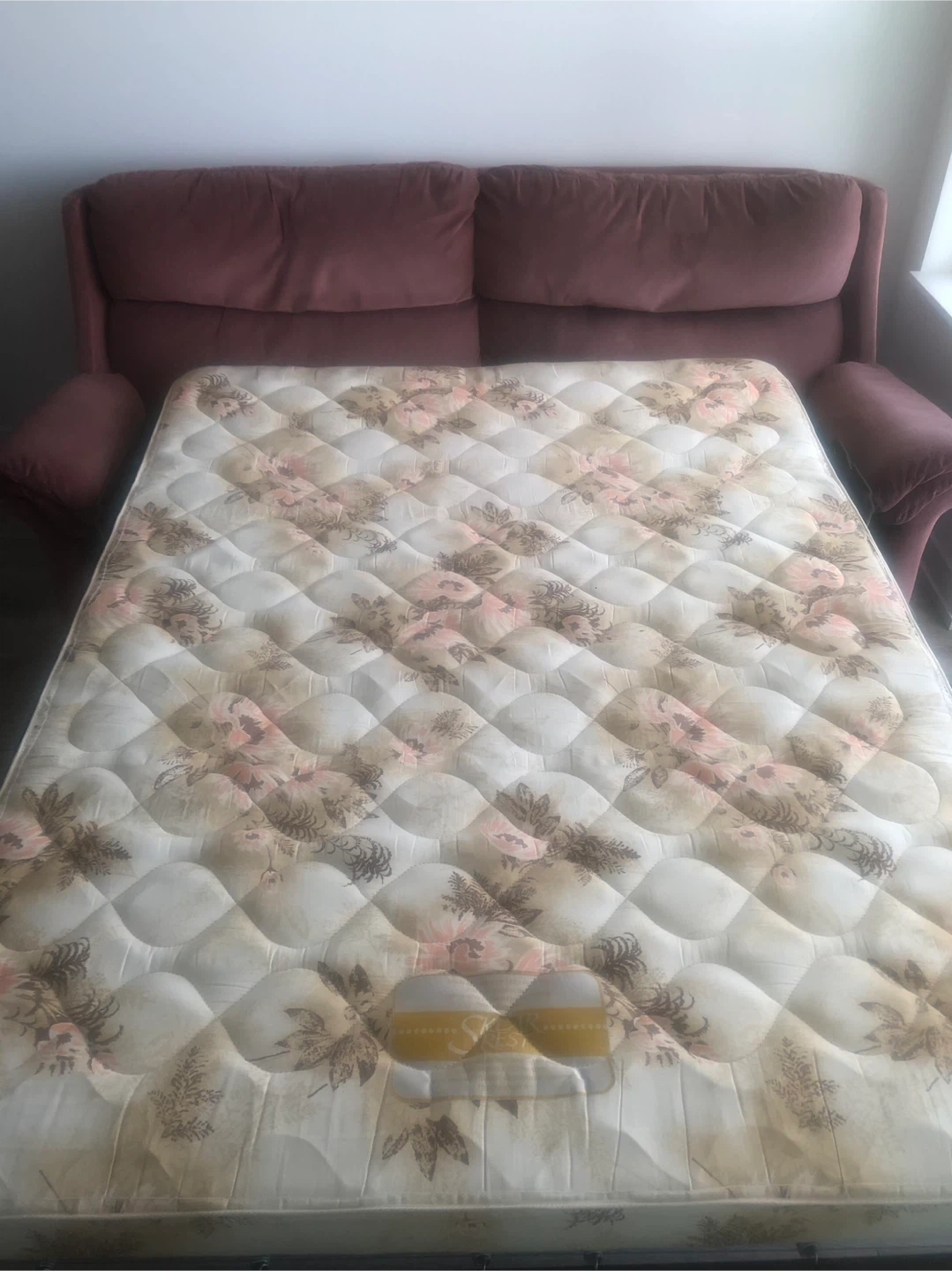 Selling a sofa bed with a floral pattern mattress! The sofa is a lovely reddish-pink colour. It's in good condition and ready for a new home. Perfect for guests or small spaces