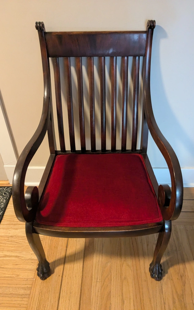 The armchair features dark wood and a plush red velvet seat. A classic design with elegantly curved arms and unique claw feet. It's a beautiful piece to add character to any room or entry.