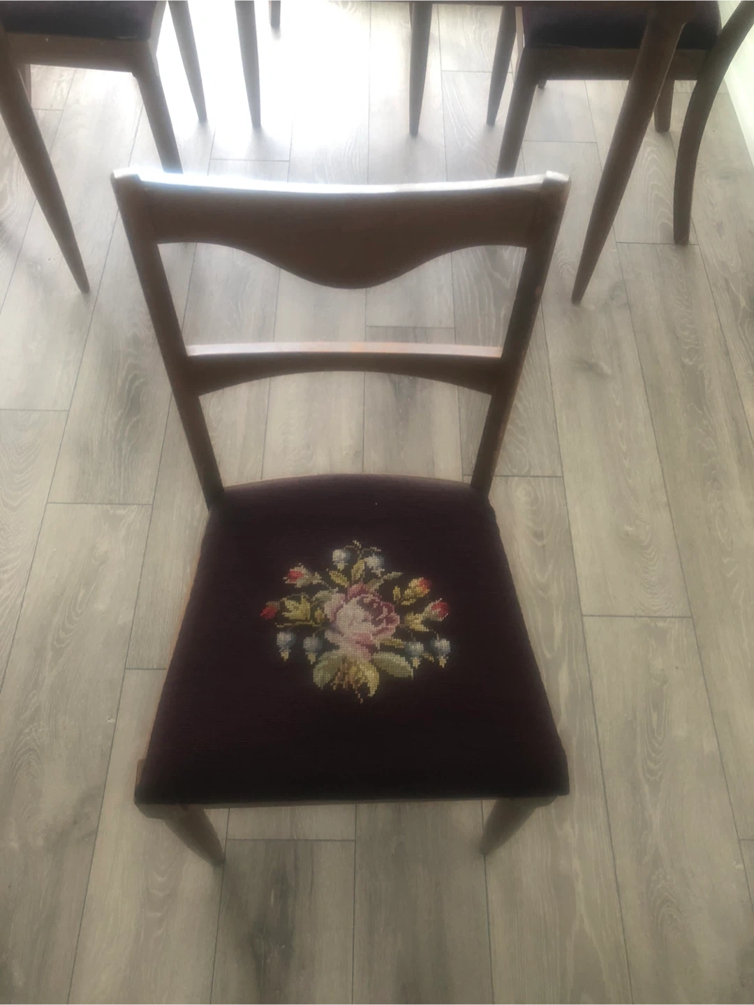 Selling a vintage expanding dining table with four chairs. The chairs have a unique floral design on the seats. Perfect for adding a touch of retro charm to your dining space!