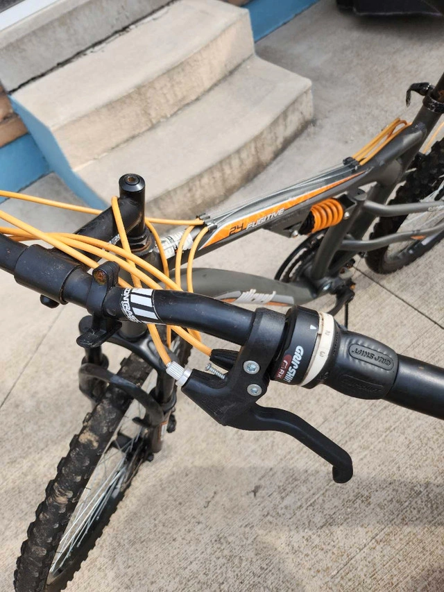 This is a Wicked Bike, a 24-inch mountain bike, perfect for hitting the trails or cruising around the neighborhood. Please note that it is in used condition, so it has some wear and tear. It's still ready for new adventures! Additional features: * Full suspension frame for a smooth ride * Shimano gearing for reliable shifting The rear brake of the bike is not working, other than that the bike is in great condition. Let me know if you're interested!