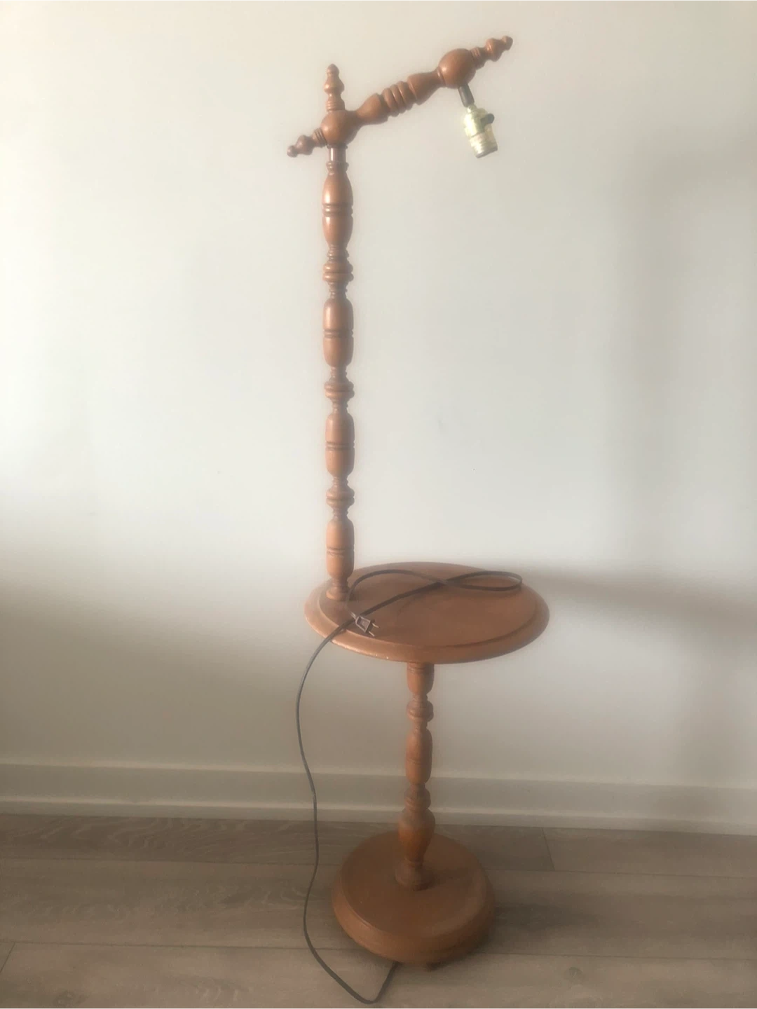 Selling a charming wooden floor lamp that also features a small table! It's a unique piece that adds a touch of warmth to any room. The lamp is in good condition and ready to brighten up your space