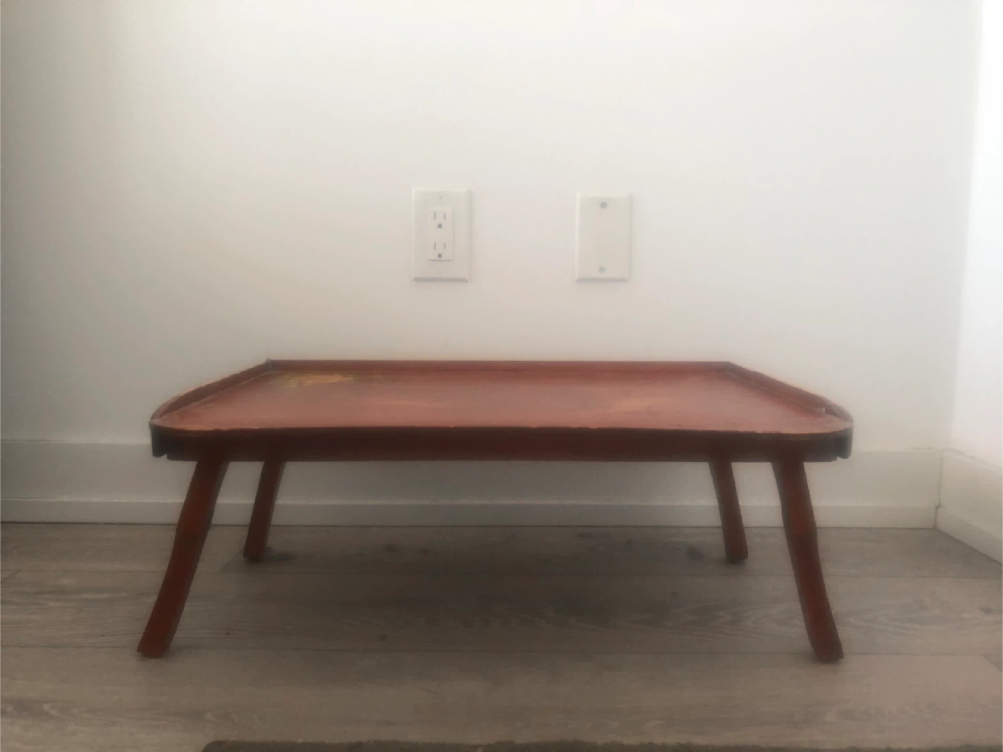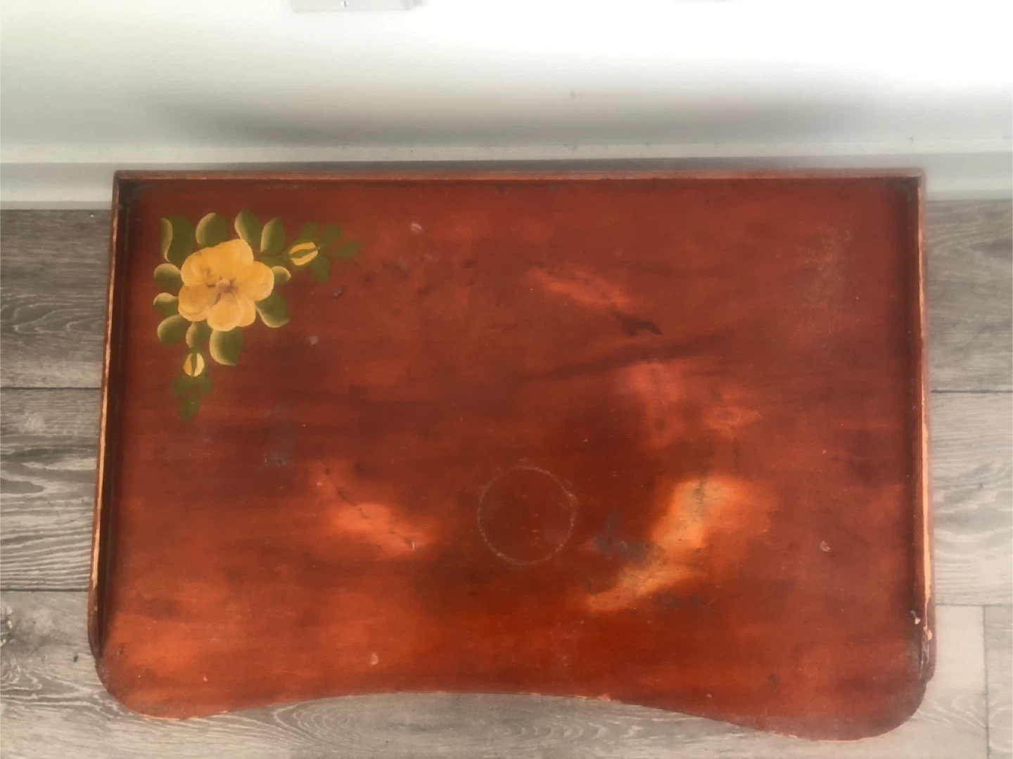 Selling a cute vintage wooden bed tray table! It has a hand-painted floral design in one corner. Perfect for breakfast in bed or working from the couch. It's in used condition, as you can see in the photos, but still has a lot of charm
