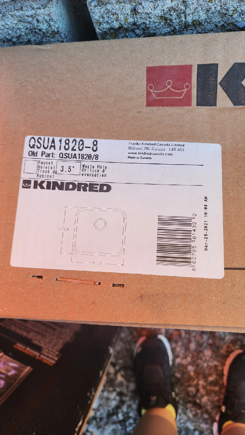 Selling a brand new Kindred QSUA1820/8 sink, still in its original box! The box includes a label with the following details: - Old Part: QSUA1820/8 - Faucet Hole(s): 3.5" - Waste Hole for evacuation Perfect for a kitchen or bathroom upgrade!
