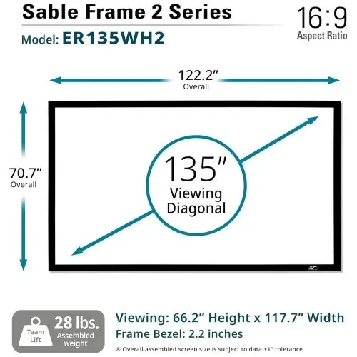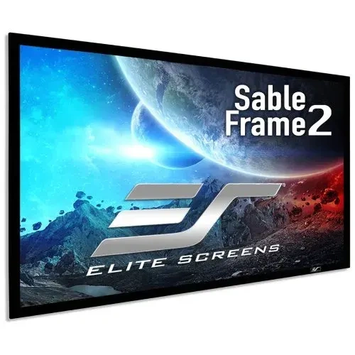 Elite Screens Sable Frame 2 series is the perfect choice for a stylishly sleek home theater room. The Sable Frame 2 series features a 2.4″ contoured black velvet covered aluminum frame with distinct crown molding edge. This attractive frame absorbs projector light overshoot while the rear adjustable fix plates provide superior tension throughout the entire screen surface. The Sable Frame 2 screen easily assembles in minutes and is ready to hang using the included sliding wall mounts that ensure a secure and centered finish. ●Sable Frame 2 : Elite Screens Sable Frame 2 series is designed to provide a stylishly sleek and beautifully flat picture, for home or business wall mount applications. Available in both CineWhite and CineGrey 3D projection screen materials. ●Frame : Sable Frame 2 series screens include a 2.4-inch thick, angular contoured aluminum frame with black velour surfacing. Made to not only enhance appearance but serves in absorbing projector light overshoot, and assists in picture contrast. ●Full Tension: Sable Frame 2’s fixed frame design allows for high tension uniformity. The fix plate tabbed backing secures tension, which results in a flawlessly taut projection surface. Arrives with Elite’s easy install rubber edge material for the fastest and easiest assembly. ●Easy Installation: Sable Frame 2 assembles in minutes and arrives with the extended installation kit which included rubber mallet, screwdriver, wood screws, anchors, and sliding wall brackets. This kit ensures a secure and properly centered finish. ●150-inch Diagonal, 16:9 Aspect Ratio. View Size: 73.6″ H x 130.7″ W. Overall Size: 78.3″ H x 135.4″ W CineWhite UHD-B, 1.3 Gain. ISF Certified. Features 180 degree viewing angle with fully black-backed front projection screen material. Easy to clean with soap and water. Compatible with Standard, Short Throw, Ultra Short Throw projectors. ●Features an easy-to-assemble, black velvet covered aluminum frame that enhances overall appearance and absorbs projector overshoot. 2.4-inch frame width. ●Sliding wall brackets and installation kit included. Sliding wall brackets allow screen to slide horizontally for properly centered installation. Installation Kit includes: Woods screws & anchors, wall brackets, screwdriver, and mallet. Mounting type: Wall Mount Product Dimensions: 3.35H Meters Material: CineWhite UHD-B Display dimensions: 311cm x 180cm Brand: Elite Screens Screen surface description: Matte Operation mode: Manual Viewing angle: 160 Degrees Item weight: 11.22 kg