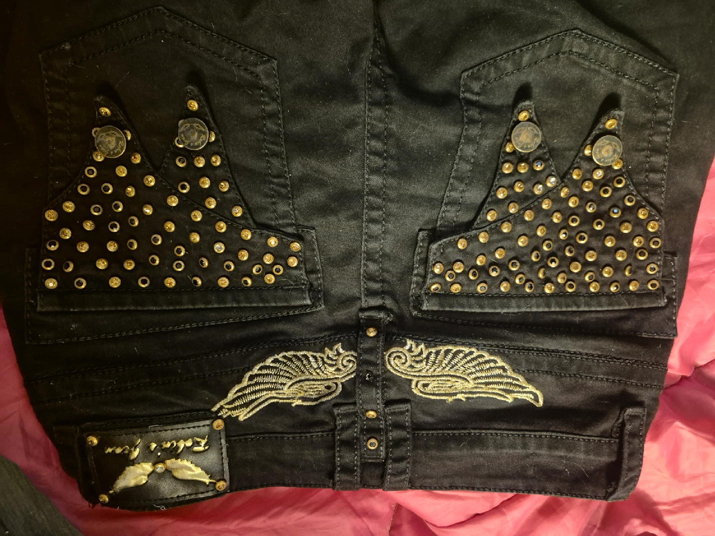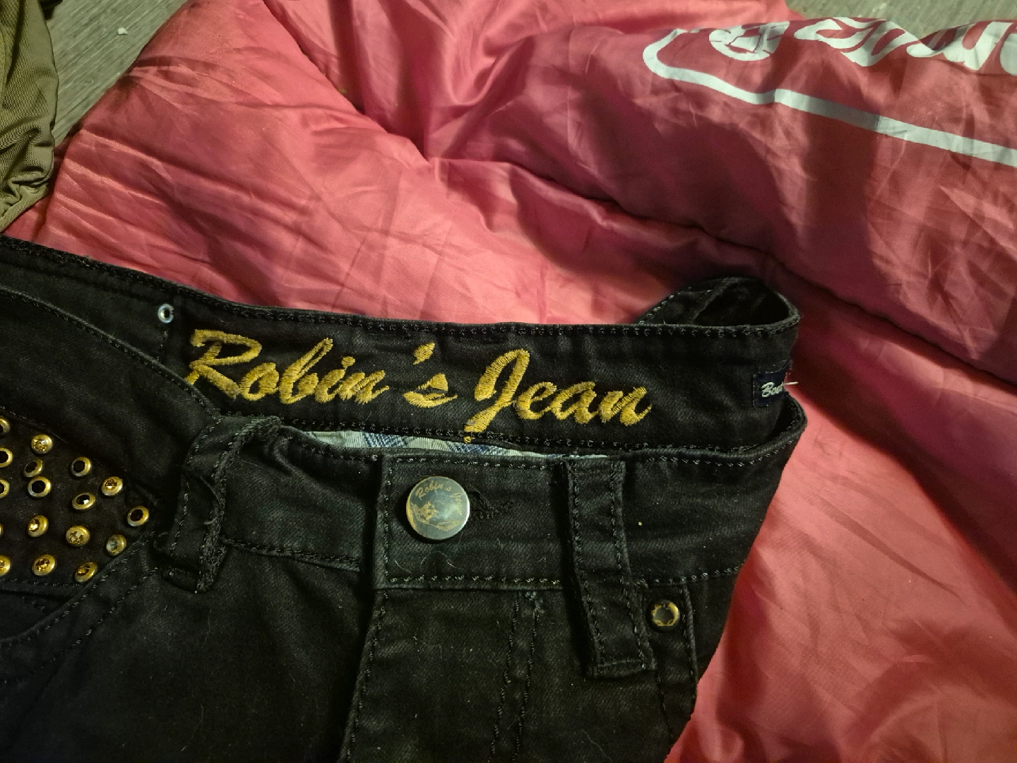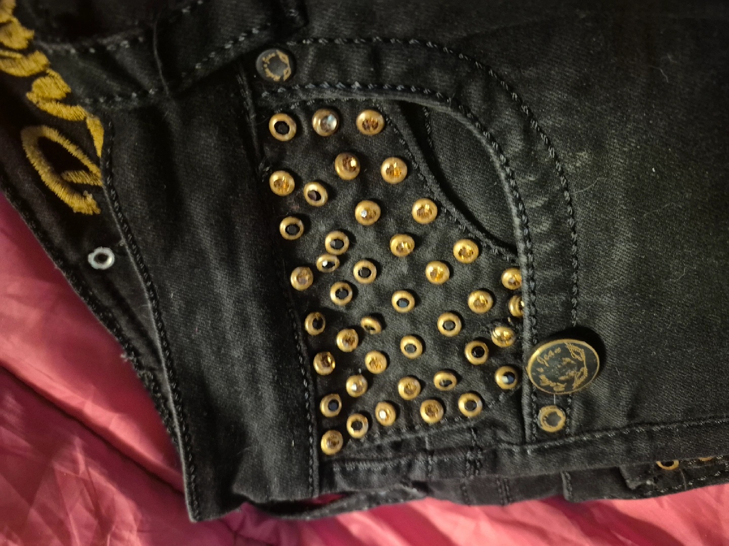 Selling a pair of Robin's Jean black denim shorts. They have gold studs and embroidered details. Great for adding some edge to your wardrobe!
