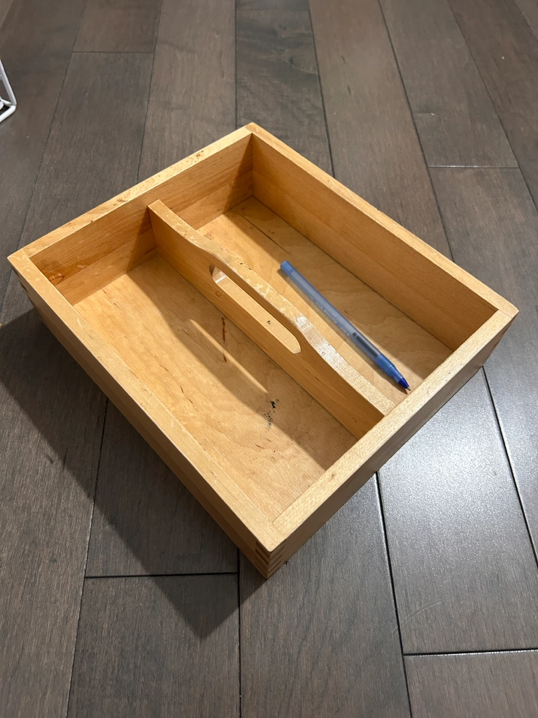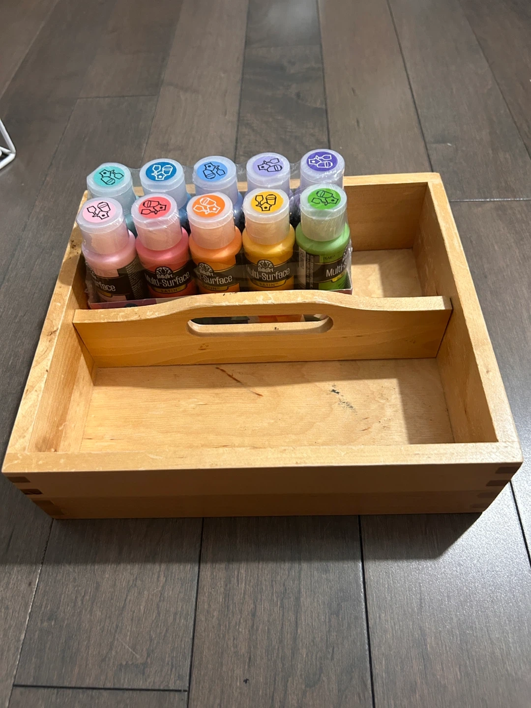 Selling a wooden caddy, perfect for storing art supplies or other small items! It has a convenient handle for carrying and a divided section to keep things organized. It's in great shape and ready for a new home. Paints are NOT included.
