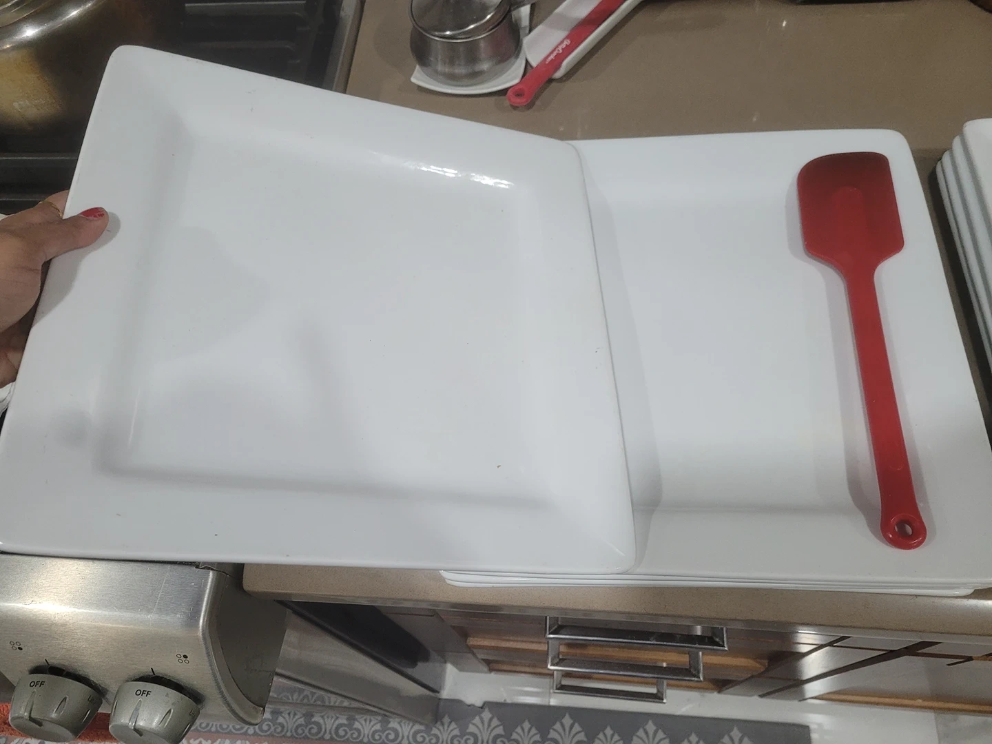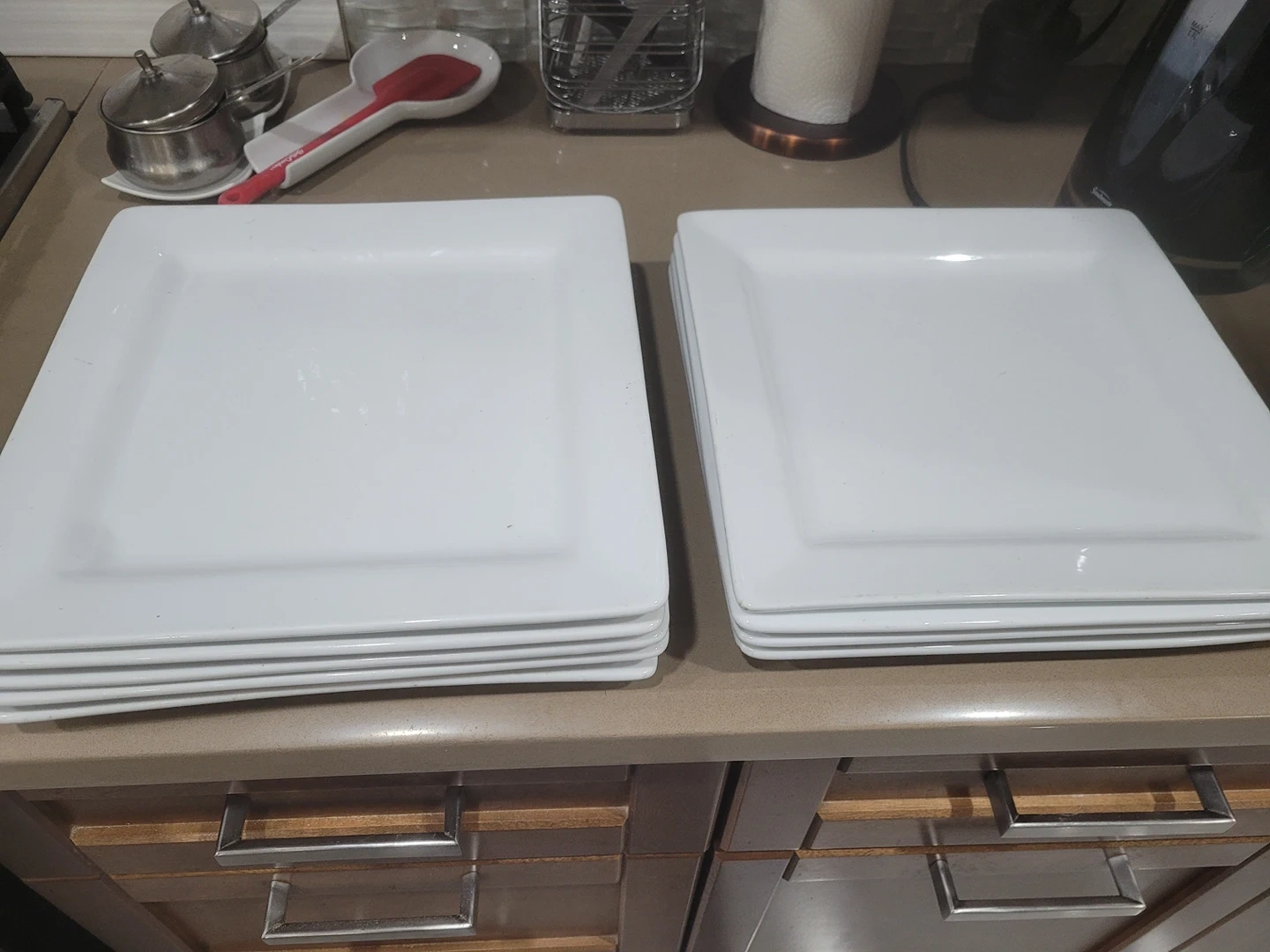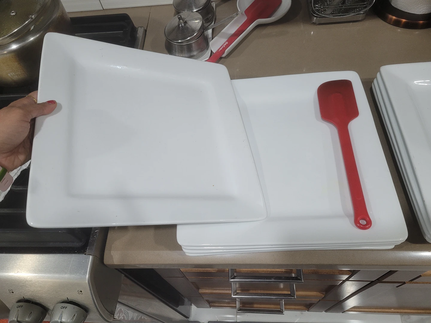square ceramic white beautiful platters ,count 9. perfect for serving dishes. heavy and sturdy. no scratches no damage. perfect. full size red spatula placed to understand the size of the platter.