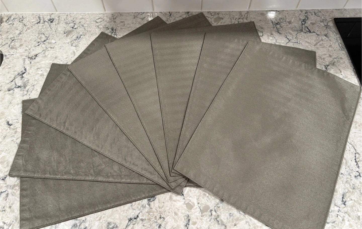 8 Machine Washable Linen Placemats (Grenish/Grey Color) Excellent condition barely used. Approx 17x12 inch No stains Machine washable Perfect for adding a touch of texture to your dining table! See other listings for more linens and kitchen accessories