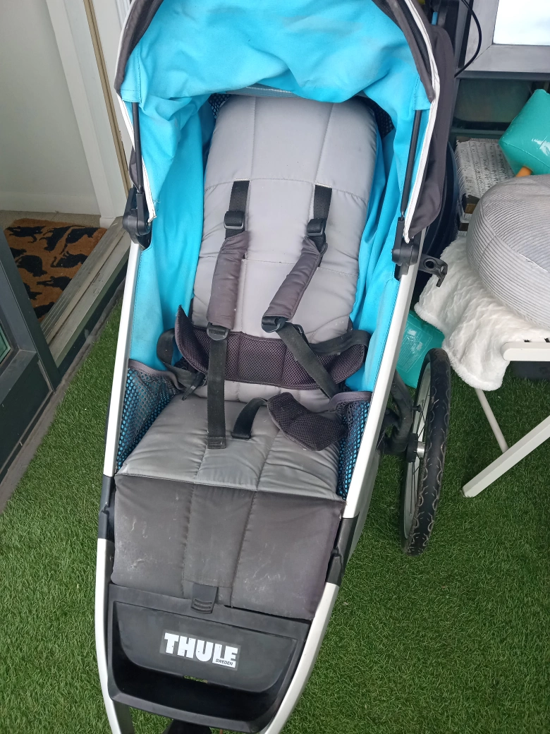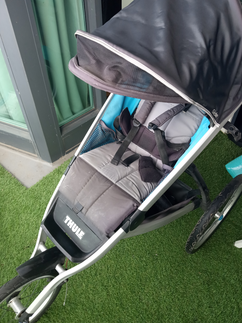Thule Urban Glide 1 Running Stroller in very good condition. Purchased in 2019 for about $600, now it's discontinued since the release of the urban glide 2. Front wheel is locked for safety. The tires need to be pumped a bit, pick up only. See link for product details: https://www.mec.ca/en/product/5041-820/urban-glide-1-stroller