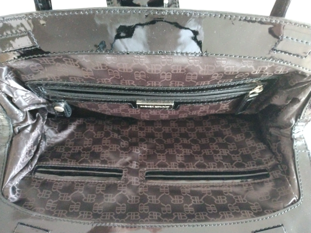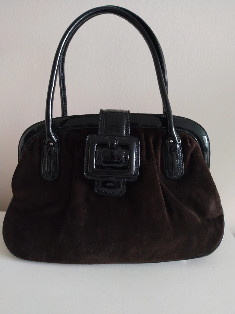 Banana Republic brown suede and black patent. Gently used purse. Snap closure outside and magnetic closure inside. Approximately 13 (l) x5 (w) x8 (h).