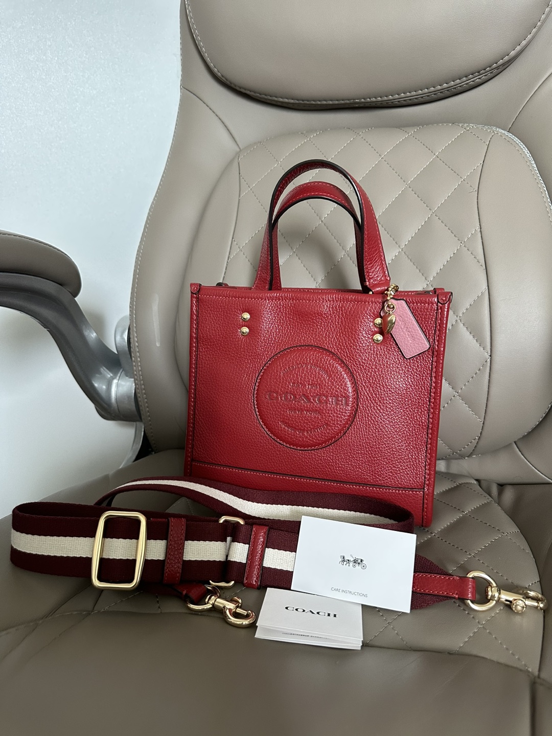 Red Dempsey Tote 22 with Coach Patch *Limited edition* with pink and gold heart solid chain and detachable strap Refined pebble leather Snap closure, fabric lining, Inside zip pocket Handles with 4 1/4" drop Four protective feet at base 8 3/4" (L) x 7 3/4" (H) x 4 1/4" (W) Used only Twice. Would pass as new. With care card.
