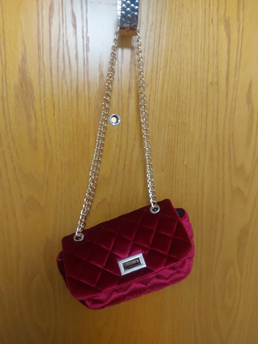 Crimson (depending on lighting) small purse, quilted velvetlike fabric. The chain can be adjusted to wear crossbody or on the shoulder. Used once, very good quality.