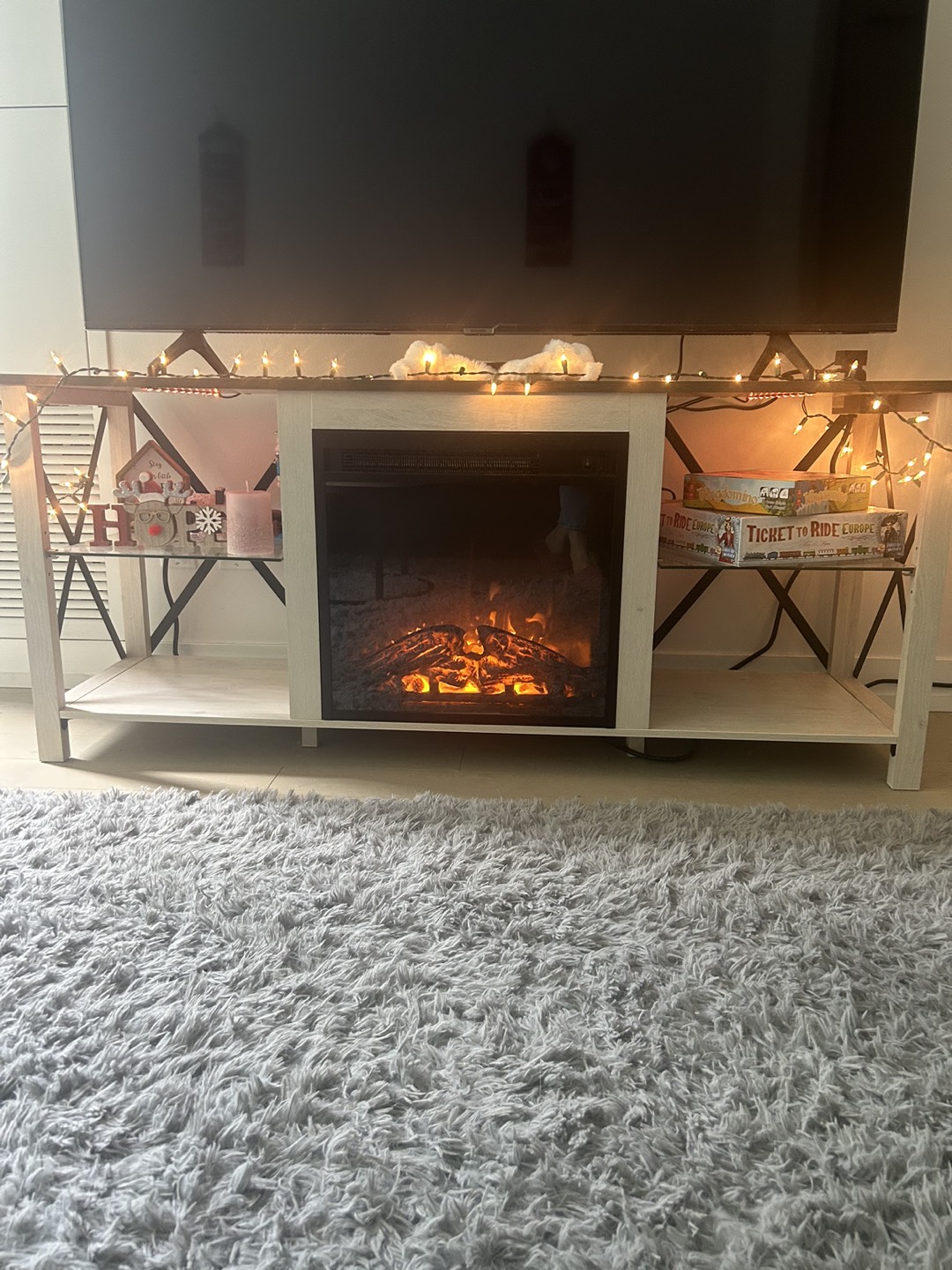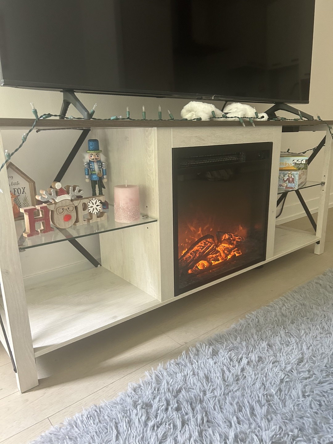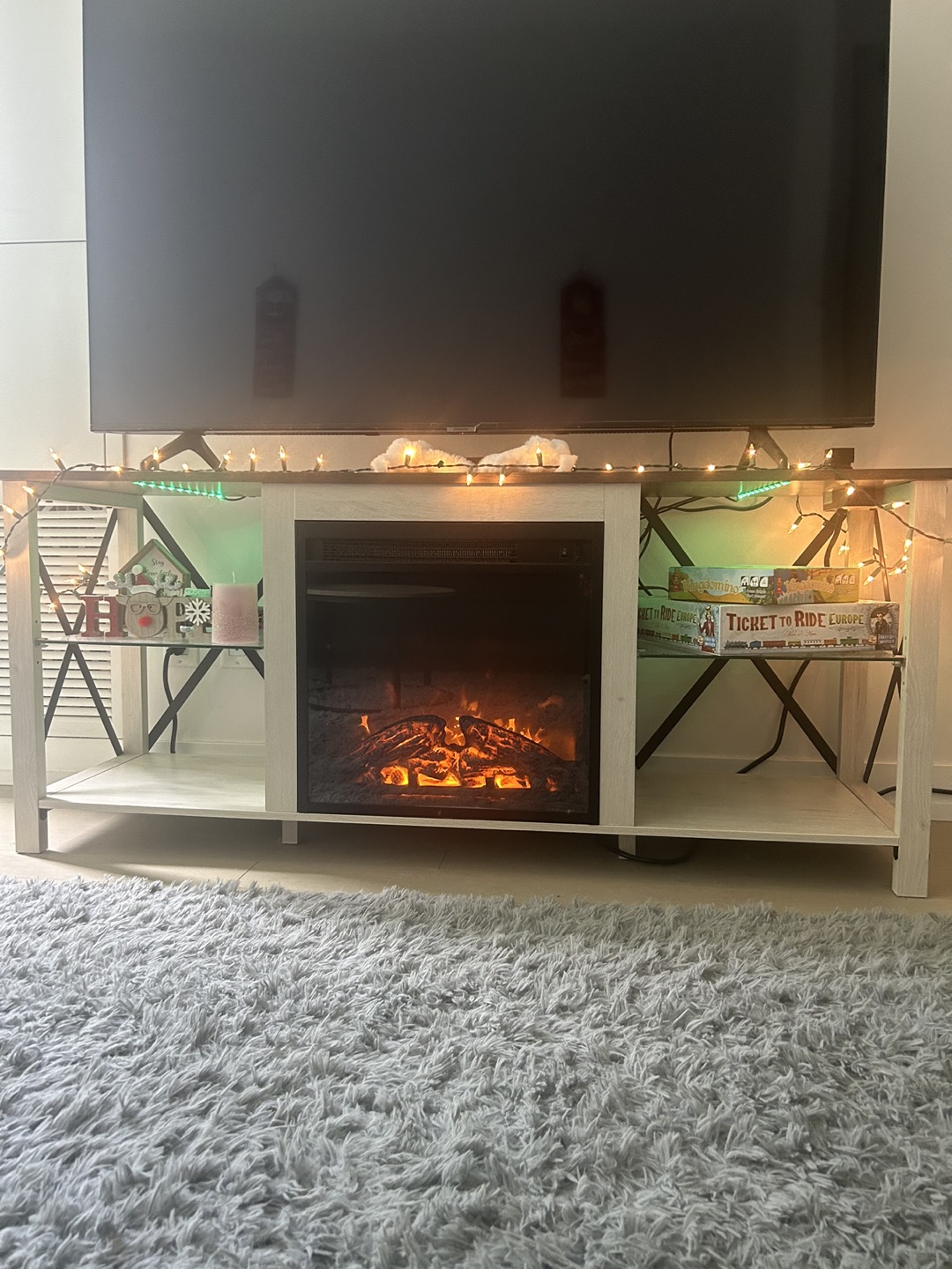 The stand was bought 5 months ago and is relatively new. Additionally, all the decorations are included for free if you're interested. Dimensions- 150.49 x 56.51 x 22.86 cm; 32.2 Kilograms Stand comes with a 18” electric fireplace insert with 2 independent switch (as heating ) and a remote control for color changing Made of medium-density fibreboard, sturdy, durable, and anti-scratched. Two extra wooden supports in the middle of the bottom can strongly support your items without worrying about shaking and deformation. (Pick up only)