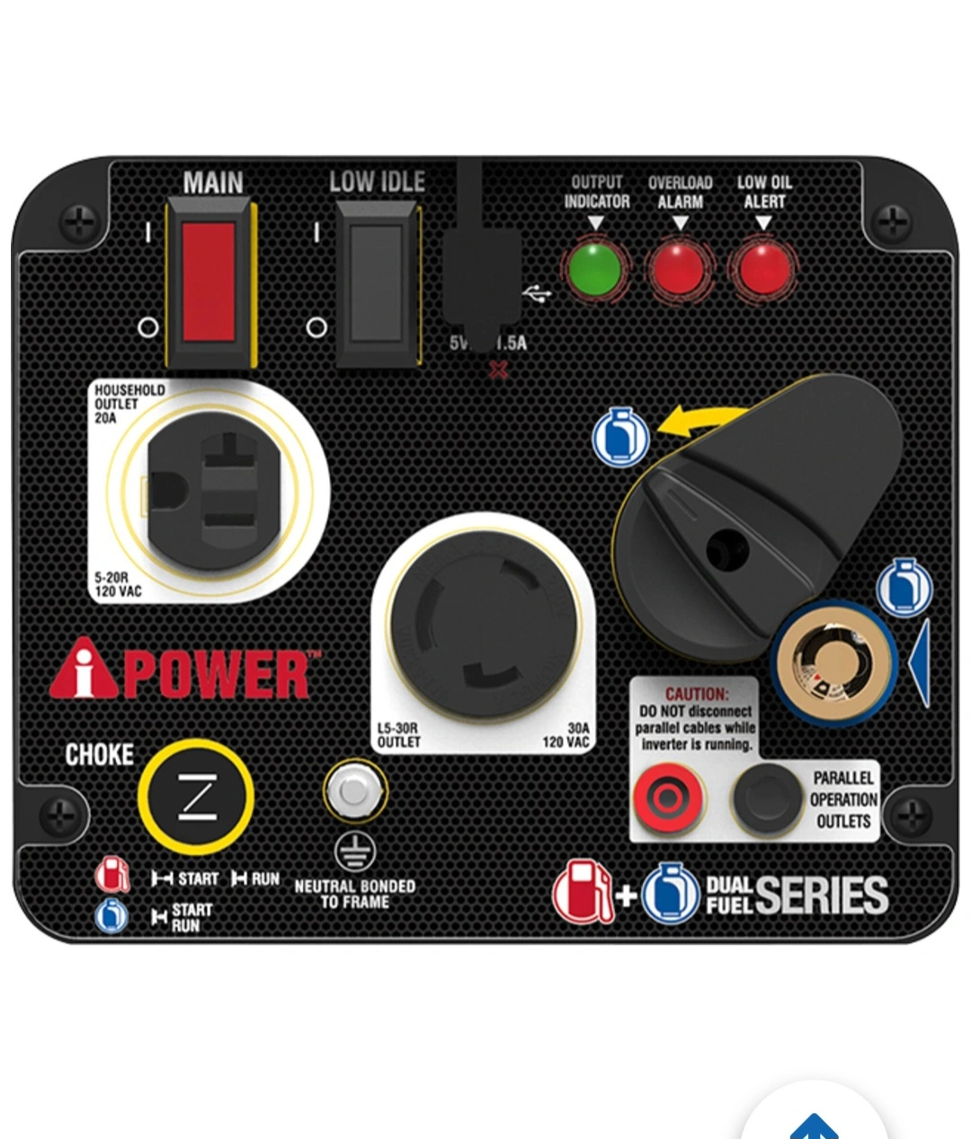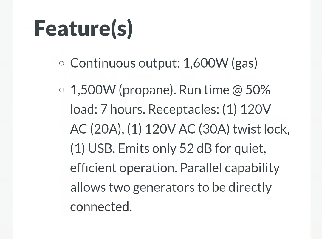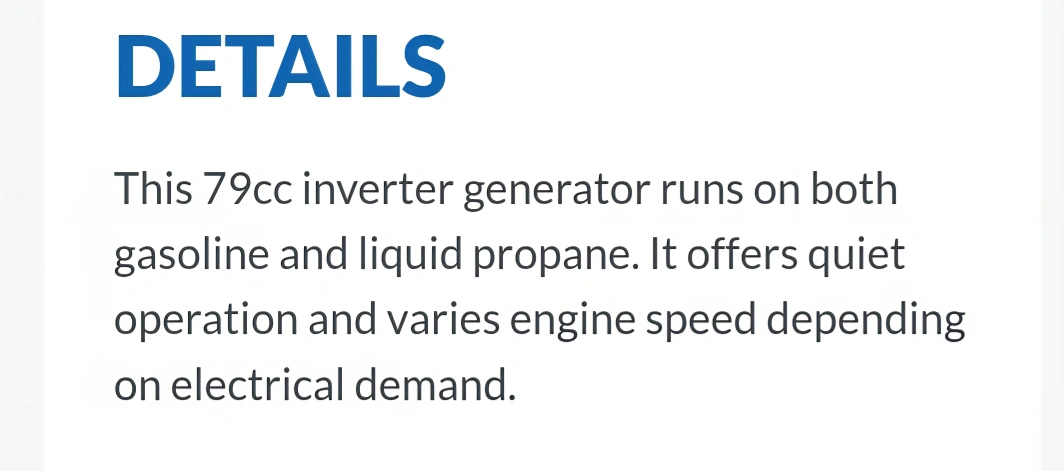 This 79cc inverter generator runs on both gasoline and liquid propane! It offers quiet operation and varies engine speed depending on electrical demand. It has a continuous output of 1,600W (gas) and 1,500W (propane). Run time at 50% load is 7 hours. It emits only 52 dB for quiet, efficient operation. Parallel capability allows two generators to be directly connected