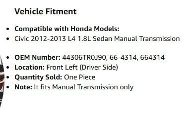Condition: Brand new Packaging: Retail packaging (sealed) Part Number: CVA0YA307-C Compatibility: • Front Left (Driver Side) • 2012–2013 Honda Civic (1.8L engine) • Manual transmission models only ✅ OEM-quality aftermarket replacement ✅ Precision machined and tested ✅ Direct fit – no modification needed ✅ Perfect for DIY repairs, rebuilds, or mechanic installs Price: $80 CAD (firm) Retail is $120+ after tax Pickup near Innisfil