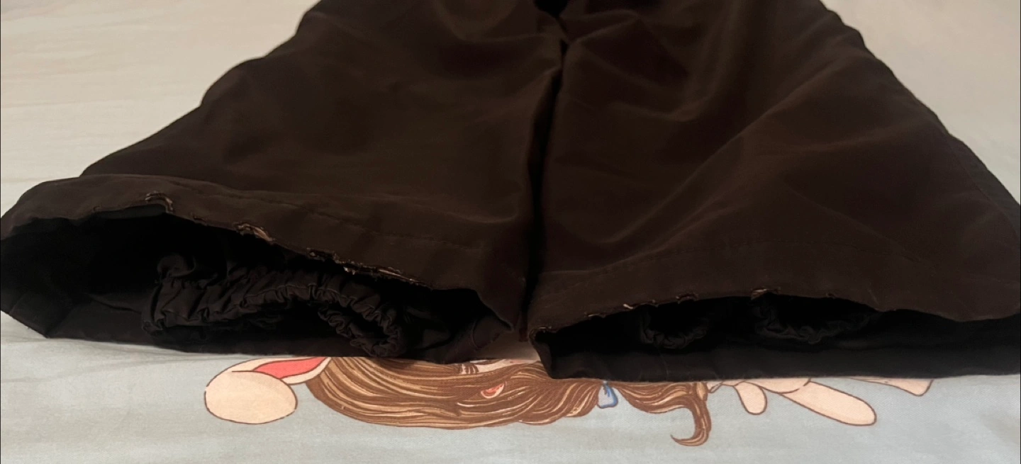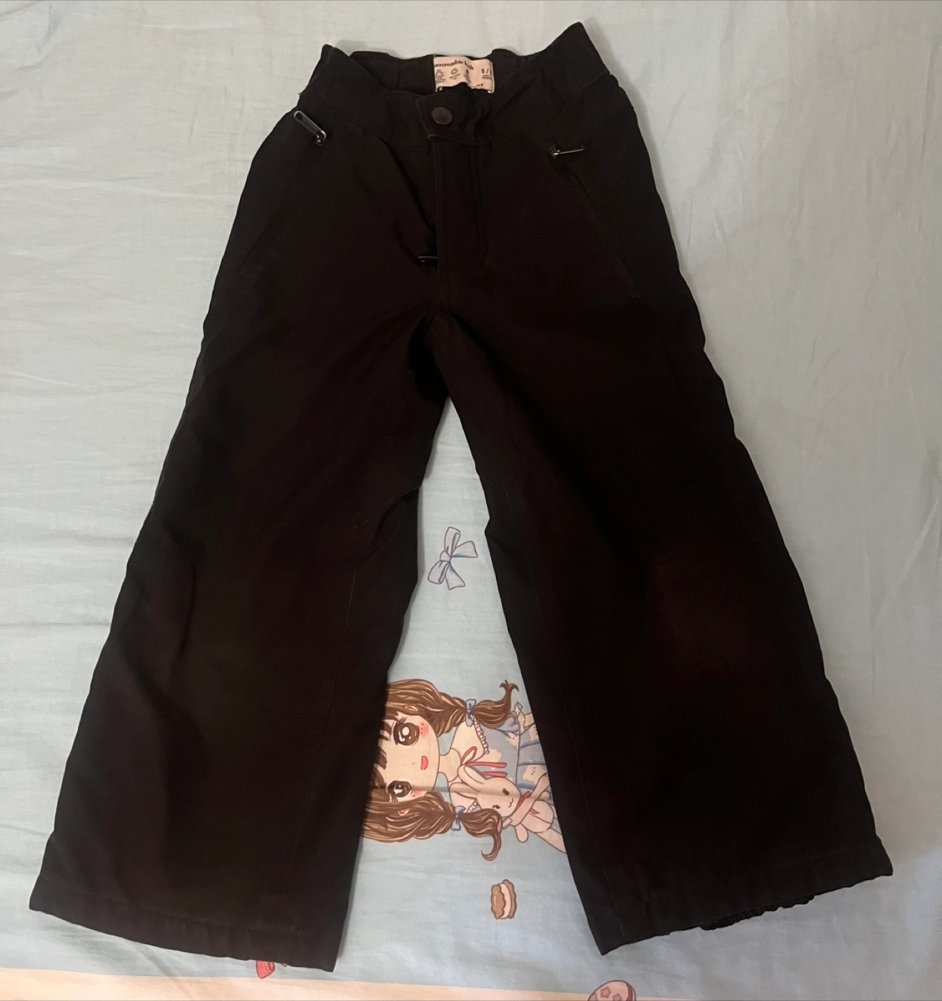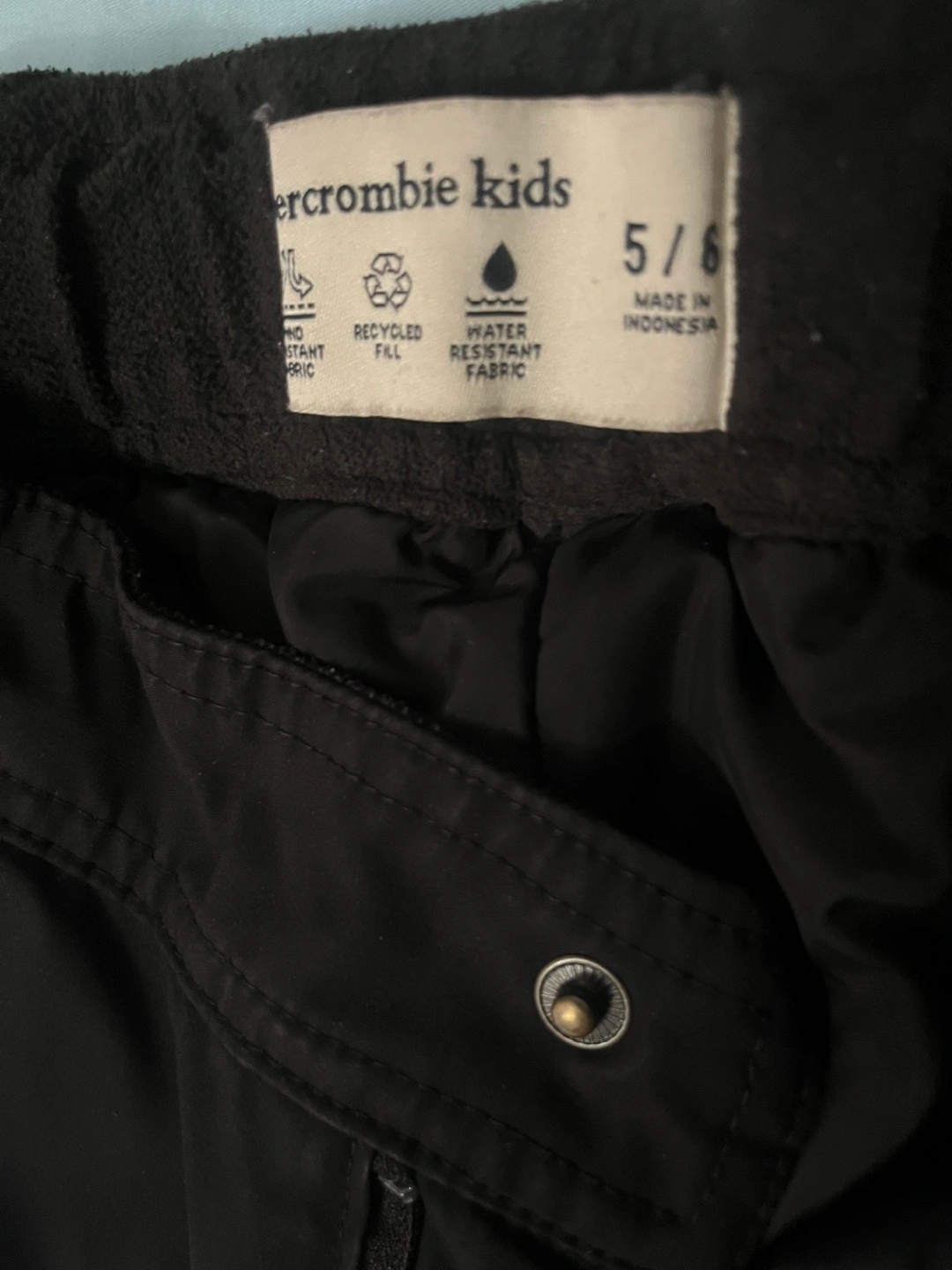 They are black and size 5/6. The pants feature a water-resistant fabric and are made with recycled fill.Cash only