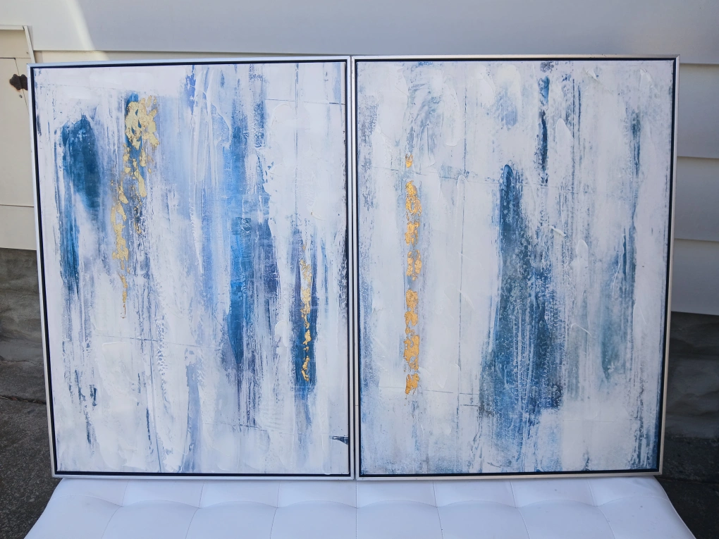 Selling a set of two framed canvas art pieces. The artwork features an abstract design with blue and gold accents, adding a touch of elegance to any room. They're in great shape and ready to find a new home! Can be used together or separately