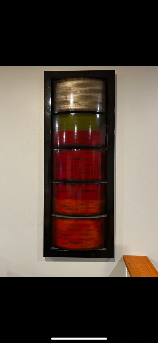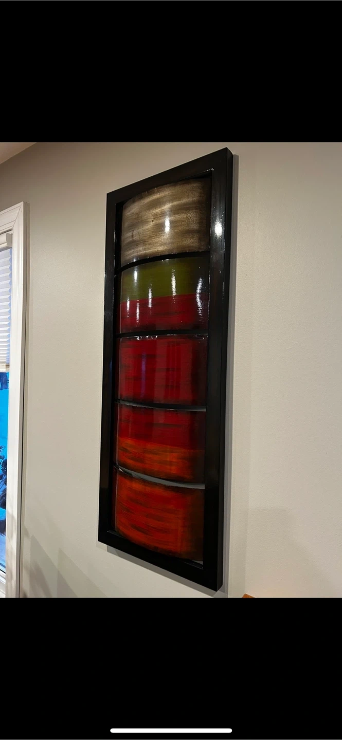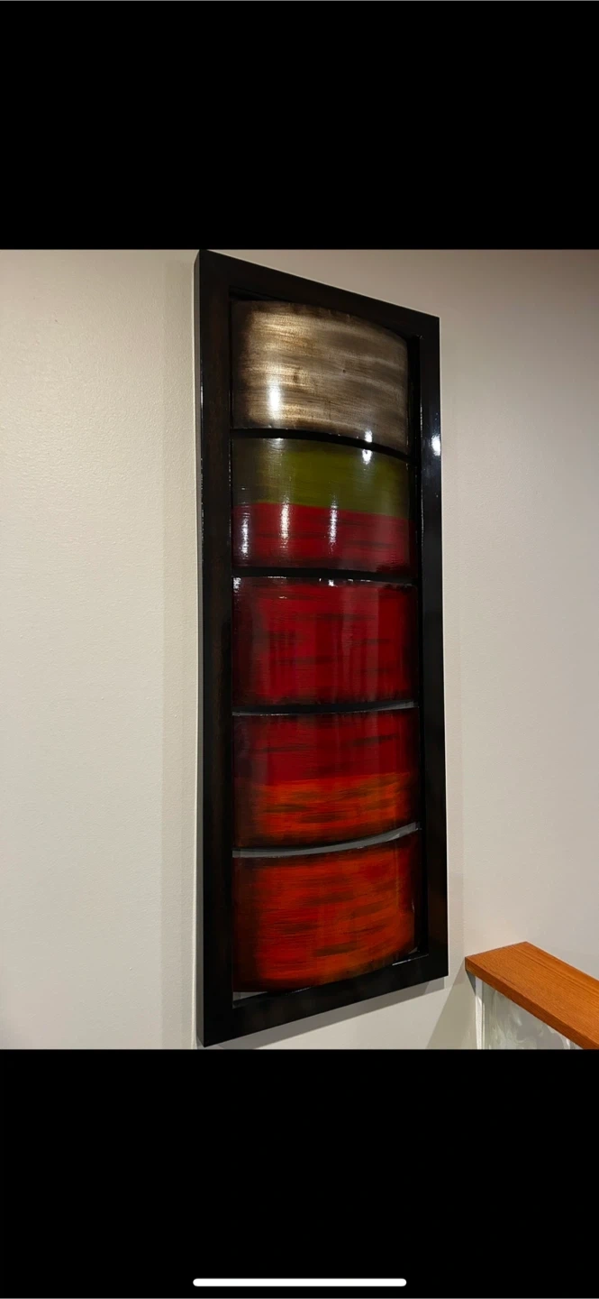 Unique abstract metal wall art with a black frame! The artwork features a stacked design with colours ranging from gold to red, adding a vibrant touch to any room.