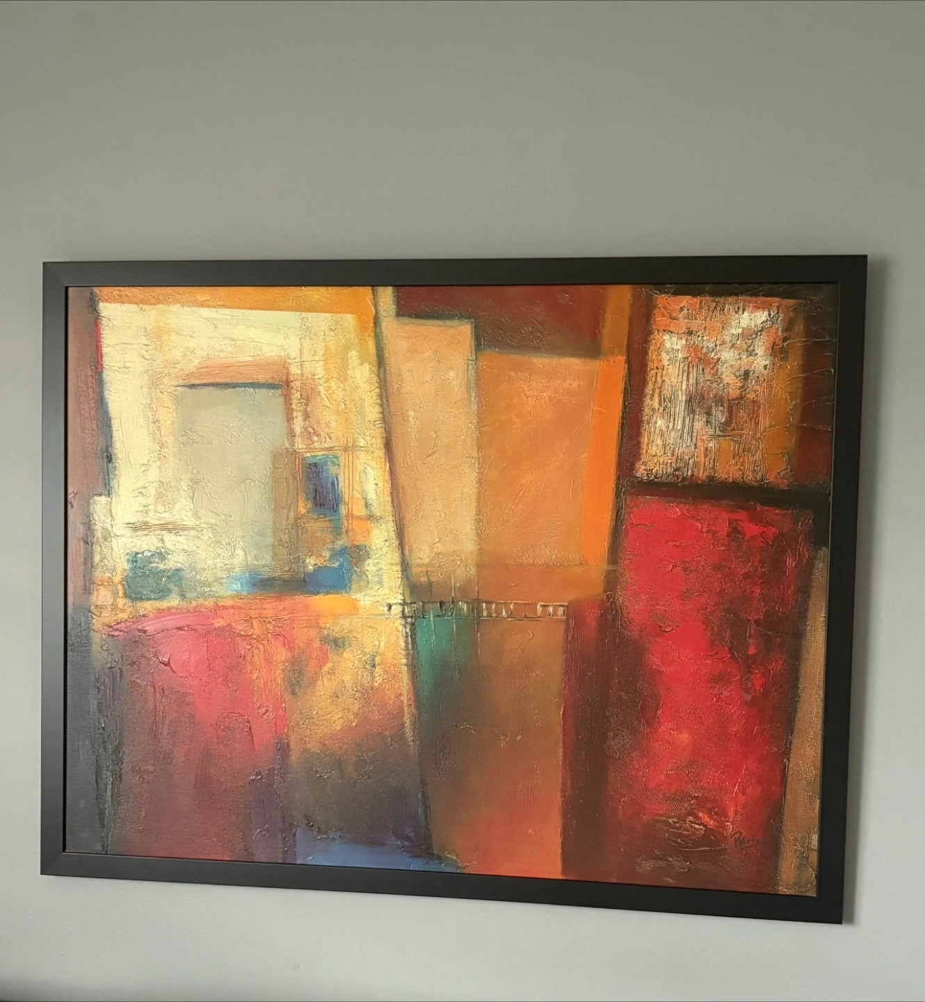 A framed piece of abstract wall art purchased from IKEA. It features a mix of warm tones like red, orange, and beige, with some cooler blues and greens. The frame is a dark brown colour. Dimensions are 46”x36”