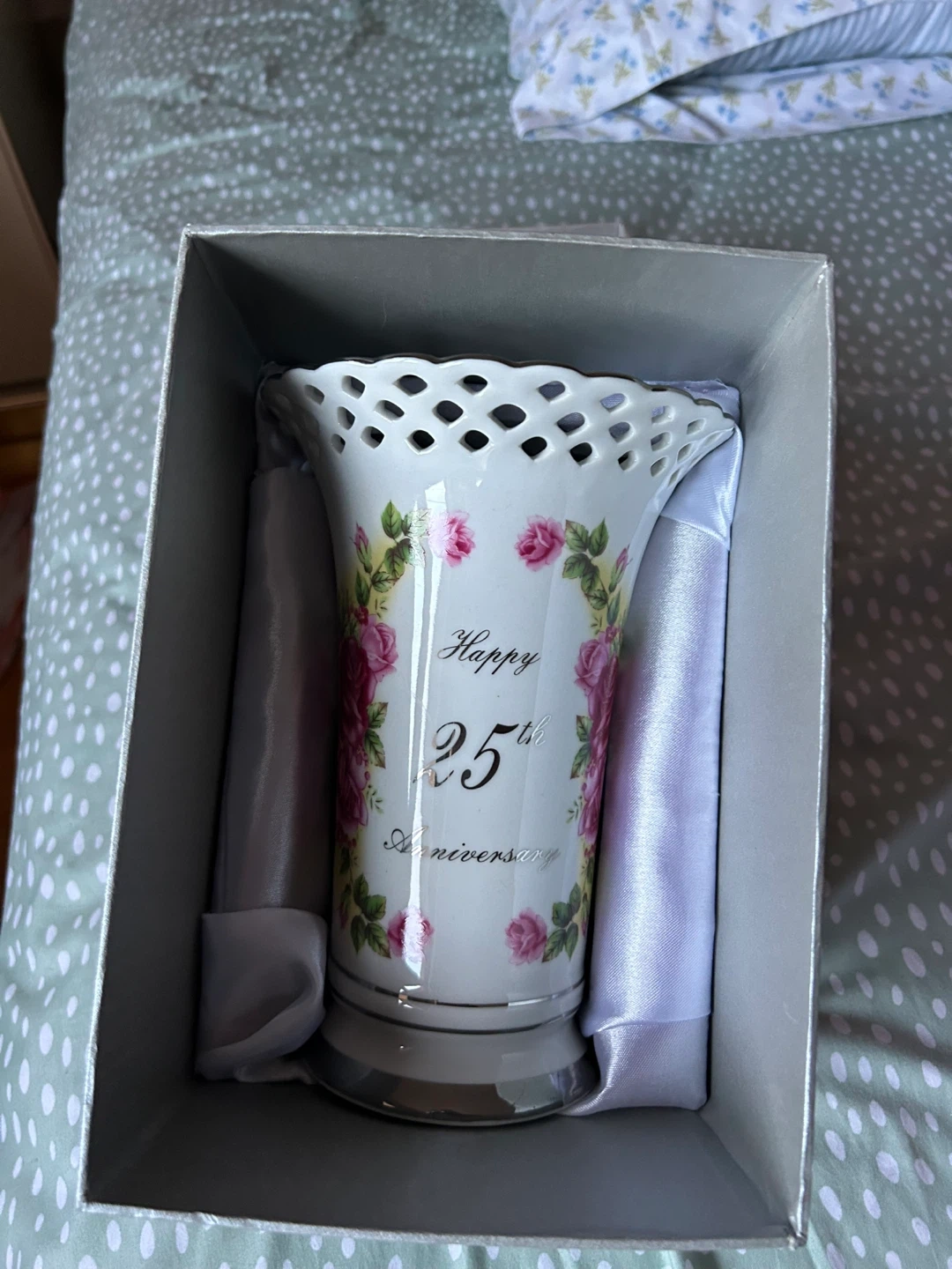 Selling a beautiful Royal Alfredo Fine Porcelain vase from ACE Gift Collection. It's in good condition and comes with its original box, making it a great gift. The vase features a delicate floral design and a 'Happy 25th Anniversary' inscription.