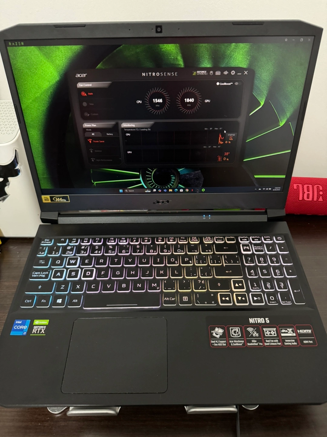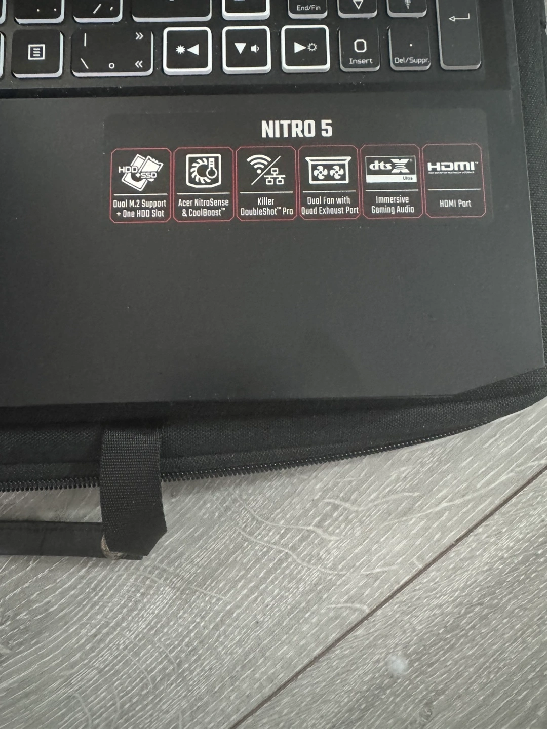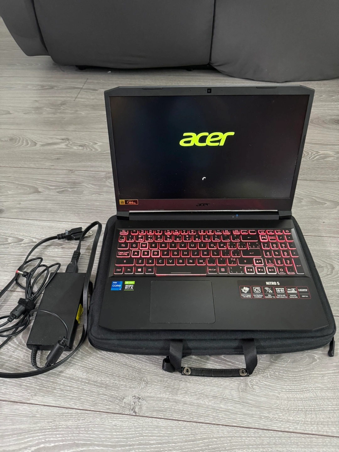 Acer Nitro 5 laptop, featuring a black finish. Displaying a keyboard and a trackpad. Power supply included, along with the charging cable. 512 GB drive capacity, this gaming laptop is as good as new no scratches. It also comes with a protective case. Originally bought it for $1600 plus tax, only selling it for $700.