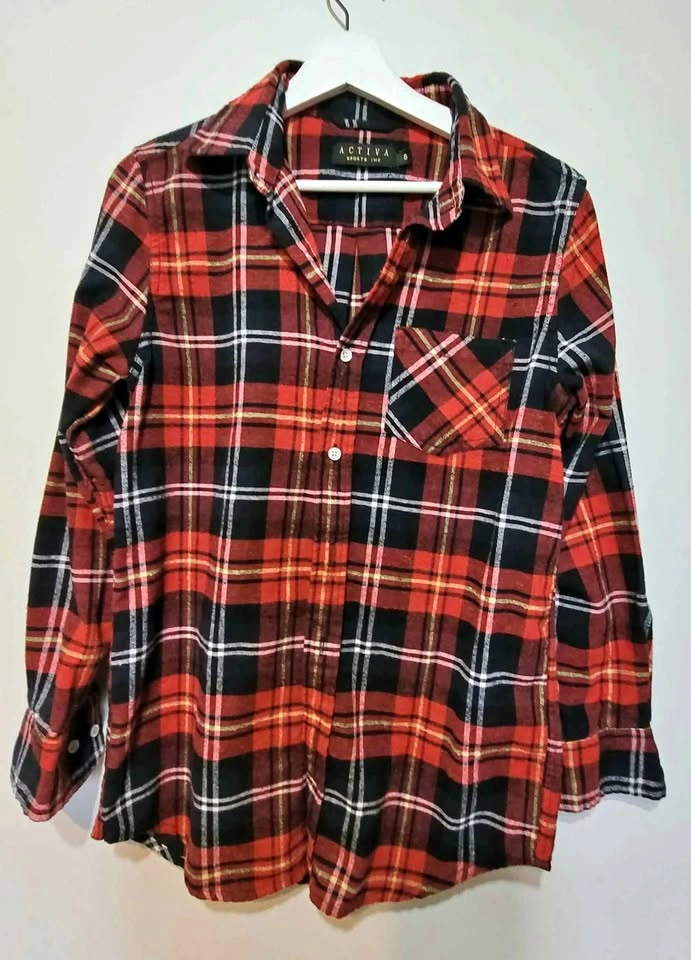 Here's a cozy Activa button up flannel shirt in a classic red and black plaid pattern! It's a size small and would be perfect for layering during the colder months. The shirt is in great condition and ready for a new home!