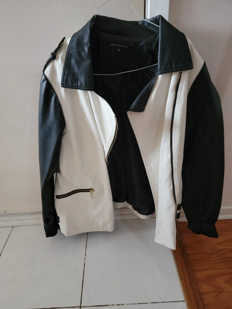 Here's an Addition Elle jacket in size 1X. It's a stylish black and white colour block design. Great for adding a bit of edge to your wardrobe!